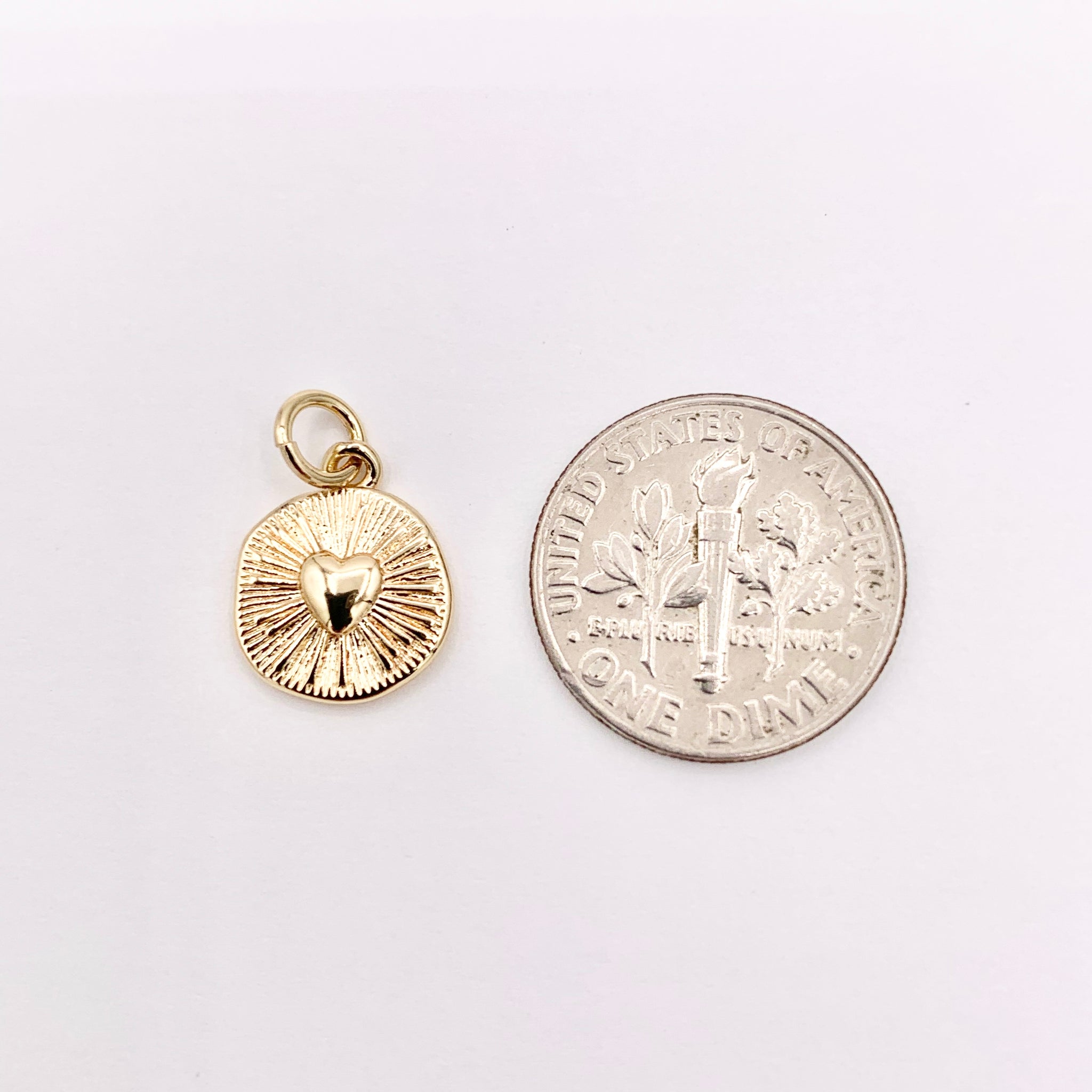 These cute little heart coin charms are real gold 18K plated with a copper base. These charms can be wonderful made into bracelets, dainty necklaces, earring drops and even used for crafts.