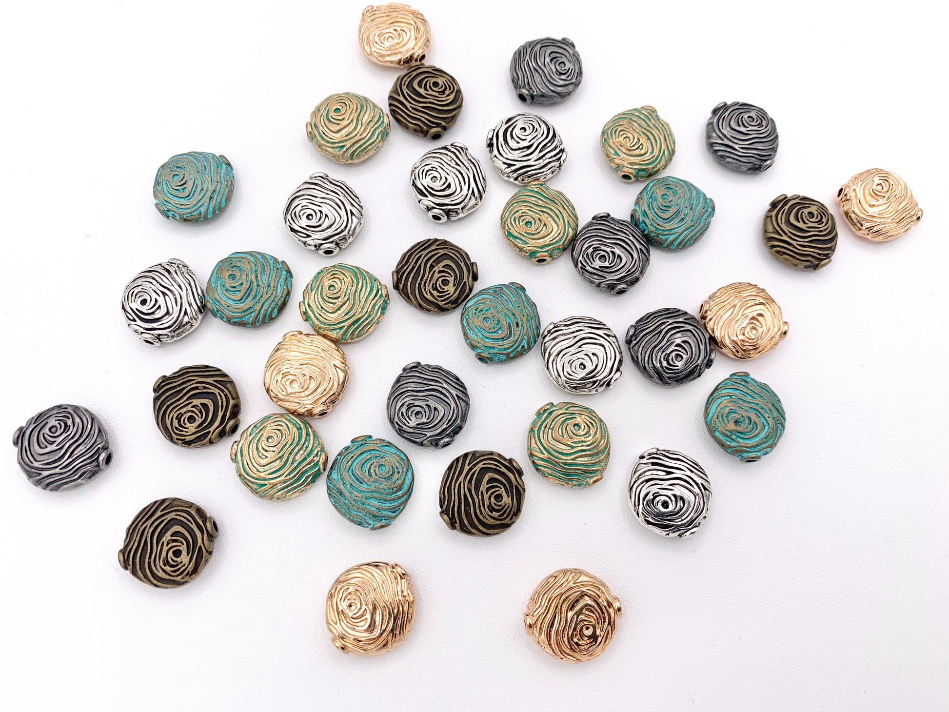 Cuentas espaciadoras en espiral de moneda en forma de remolino de peltre de 13x14 mm, oro rosado, plata, bronce, bronce y pátina