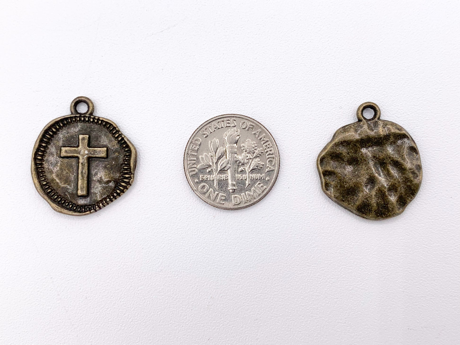 Dijes de monedas cruzadas pequeñas de peltre de 19 mm en oro antiguo, oro brillante, plata, bronce, cobre, bronce y pátina azul