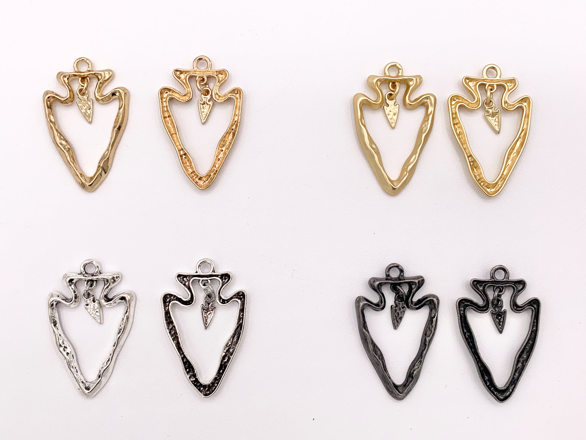 Colgantes de punta de flecha hueca de peltre de 25x40 mm con pequeño dije colgante en oro, oro mate, plata, cobre, latón, bronce y pátina azul