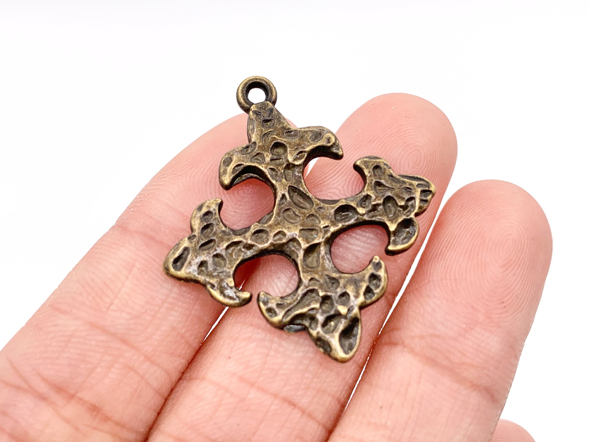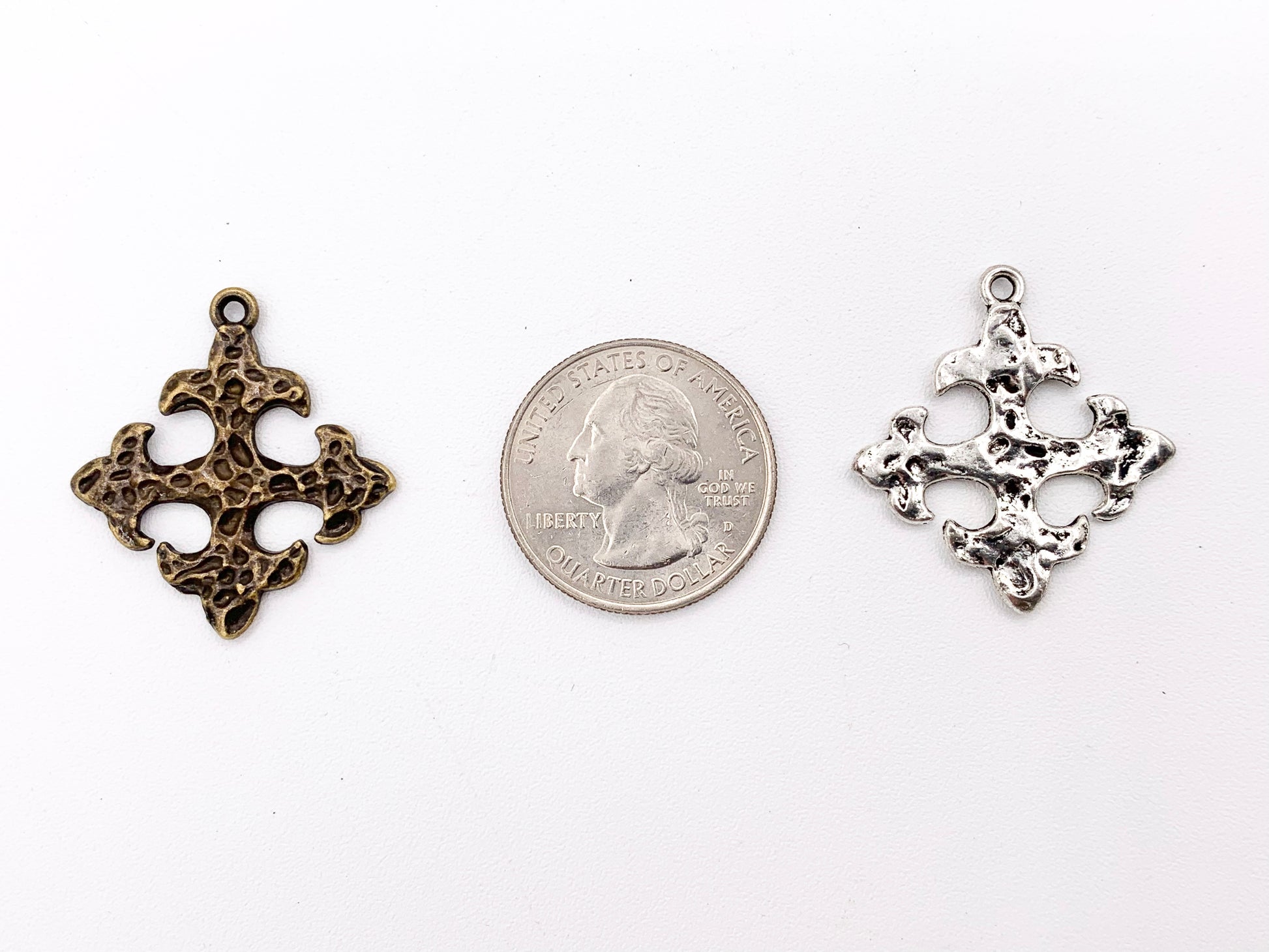 Colgantes martillados Fleury de cruz de peltre de 27 mm en oro antiguo, oro rosado, plata, bronce, cobre, bronce de cañón, pátina verde y azul
