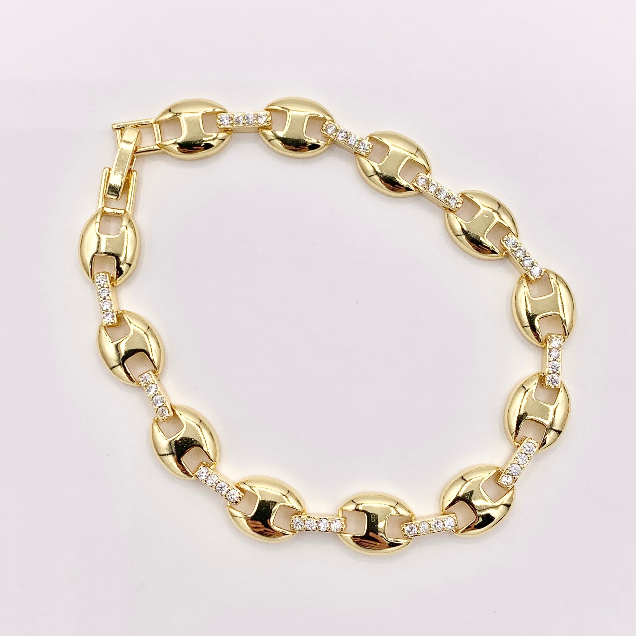These delicate rhinestone coffee bean/puffy mariner link chain bracelets are made with real 18k Gold plated Copper.