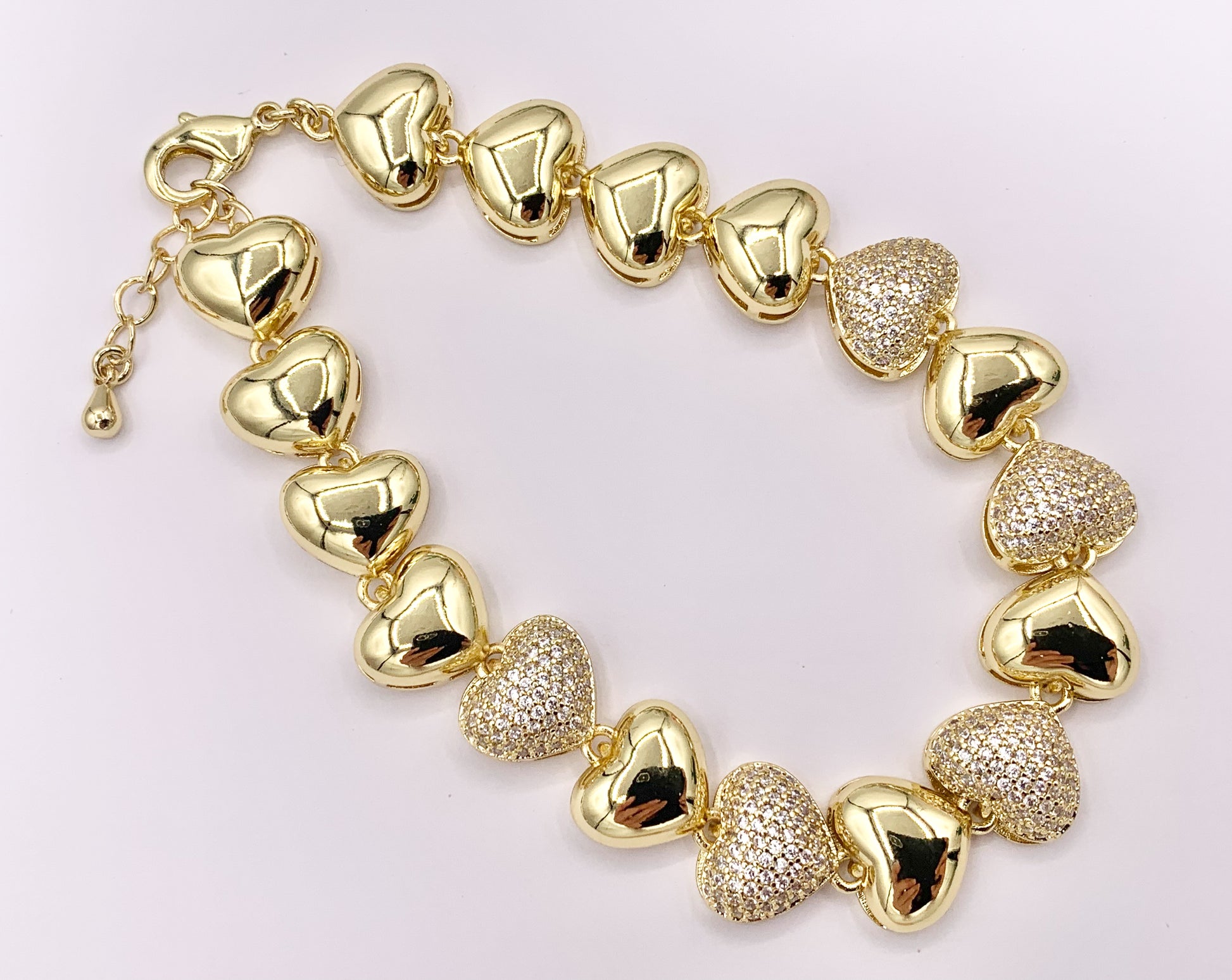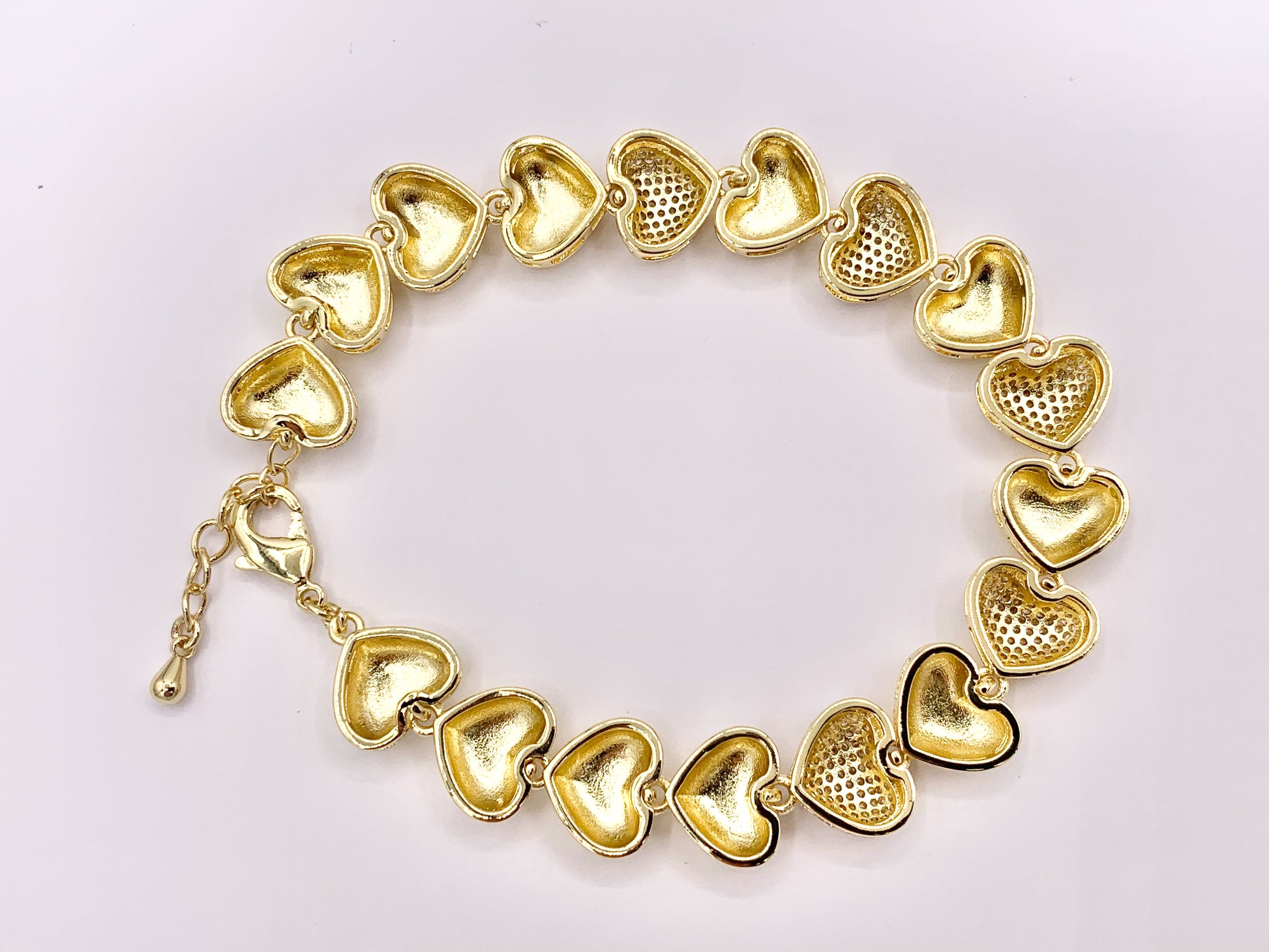 These delicate rhinestone hearts bracelets are made with real 18k Gold plated Copper.