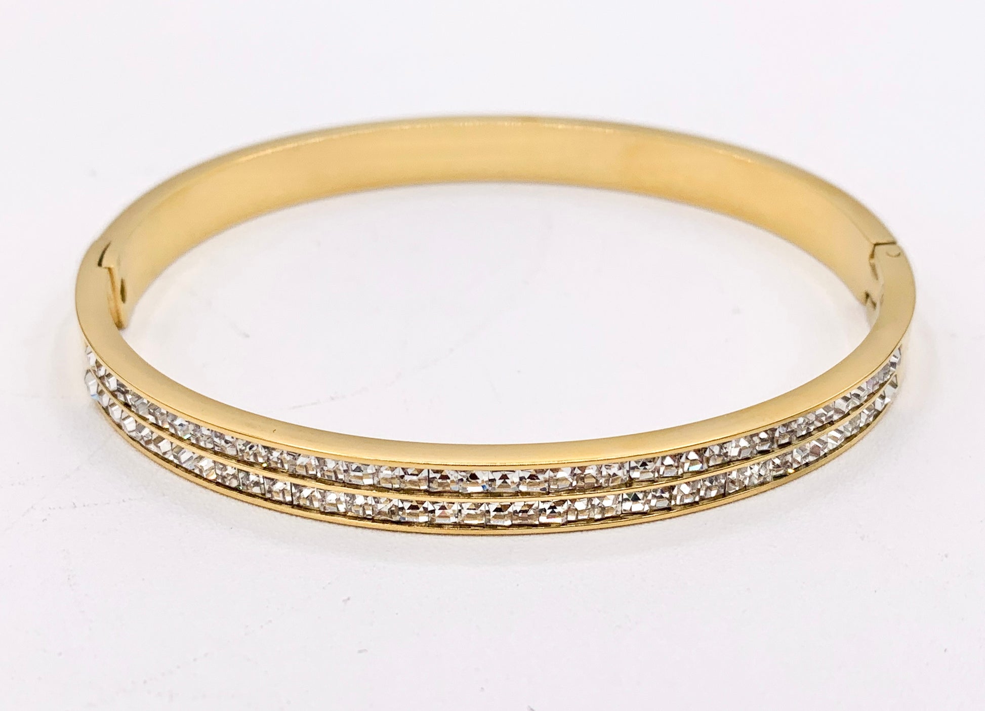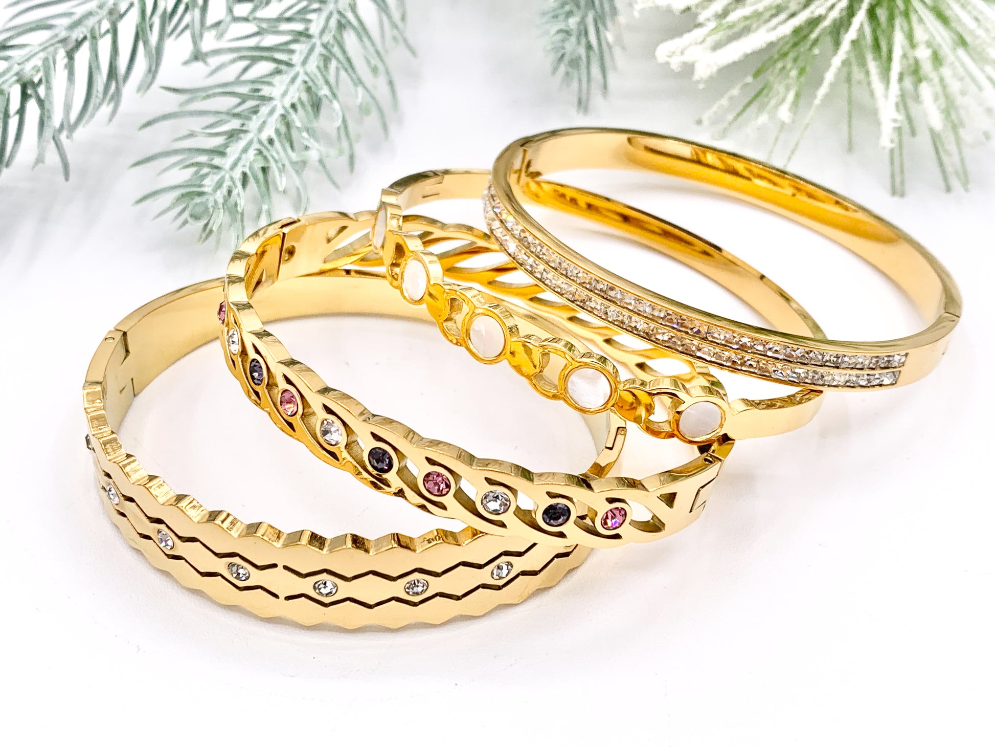 7 " Stainless Steel Bracelets CZ Multi Shell Acetate White Twist Coin Rhinestone Close Bangles in 18K Gold plated Stainless Steel 2pcs