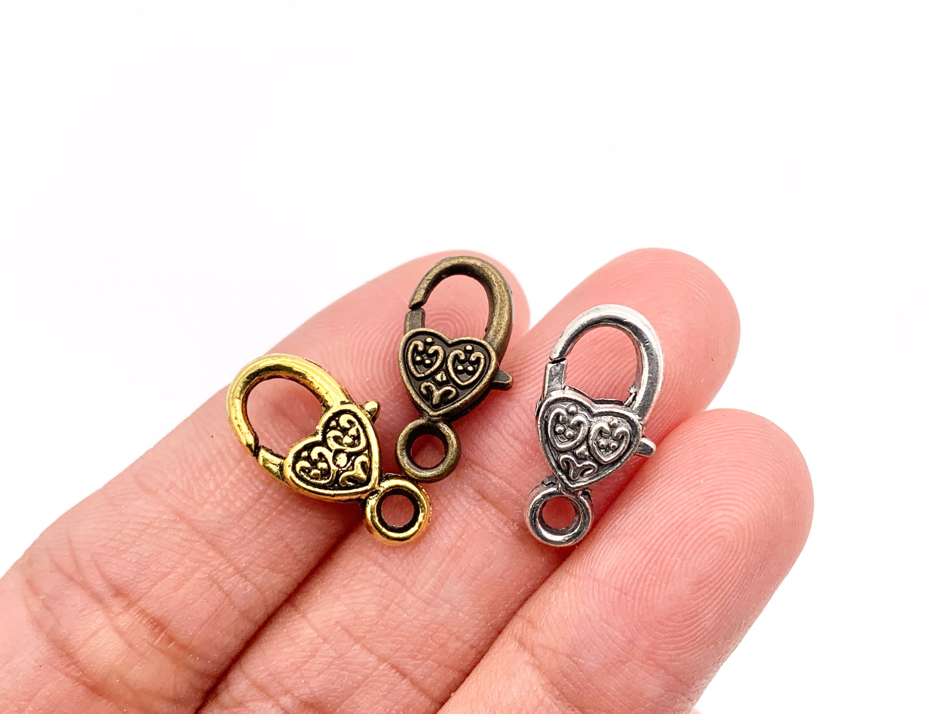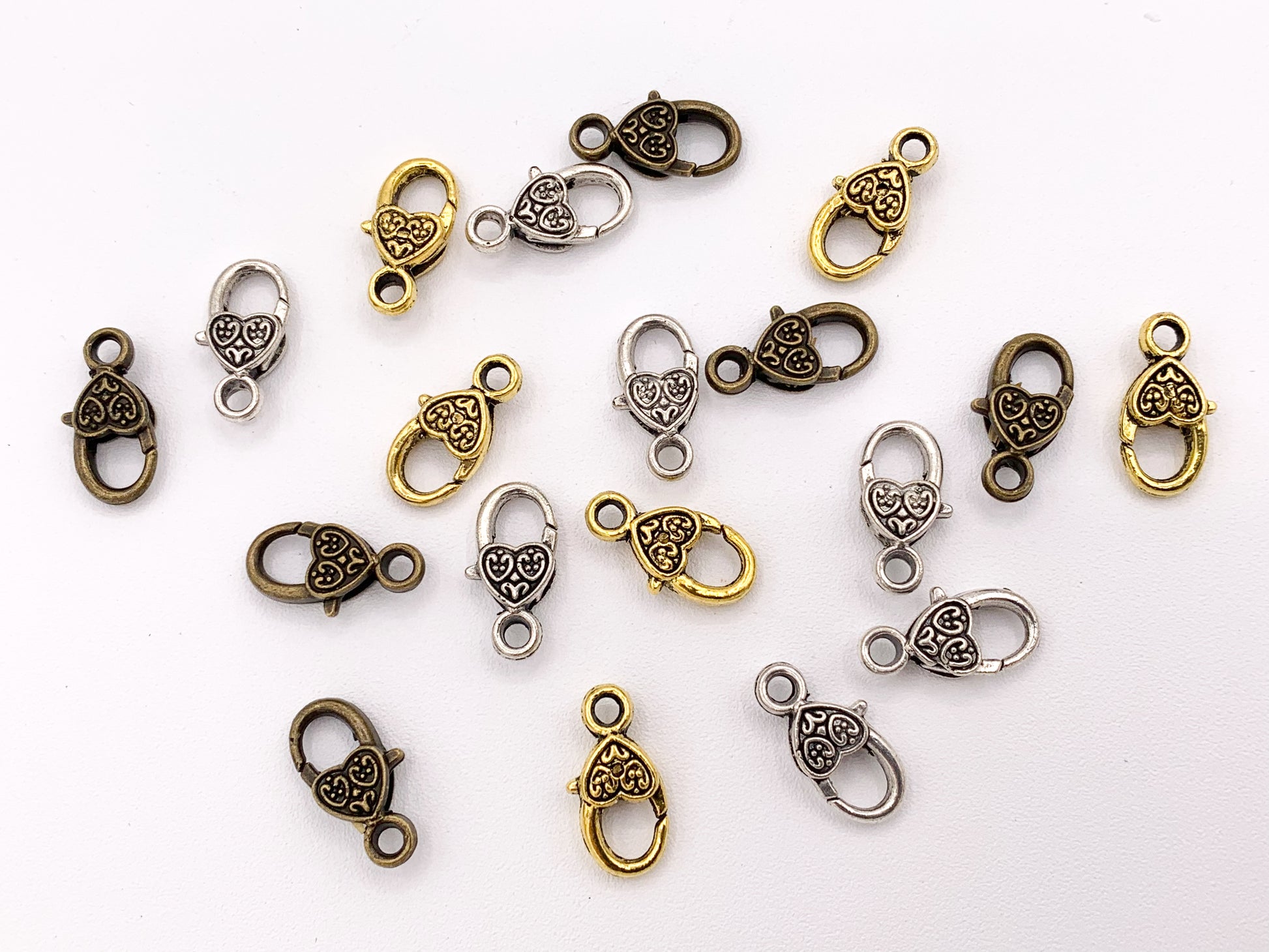 Cierres de garra de langosta con forma de corazón antiguo de peltre de 9x17 mm, pedido a granel en oro, plata y latón, 24 piezas