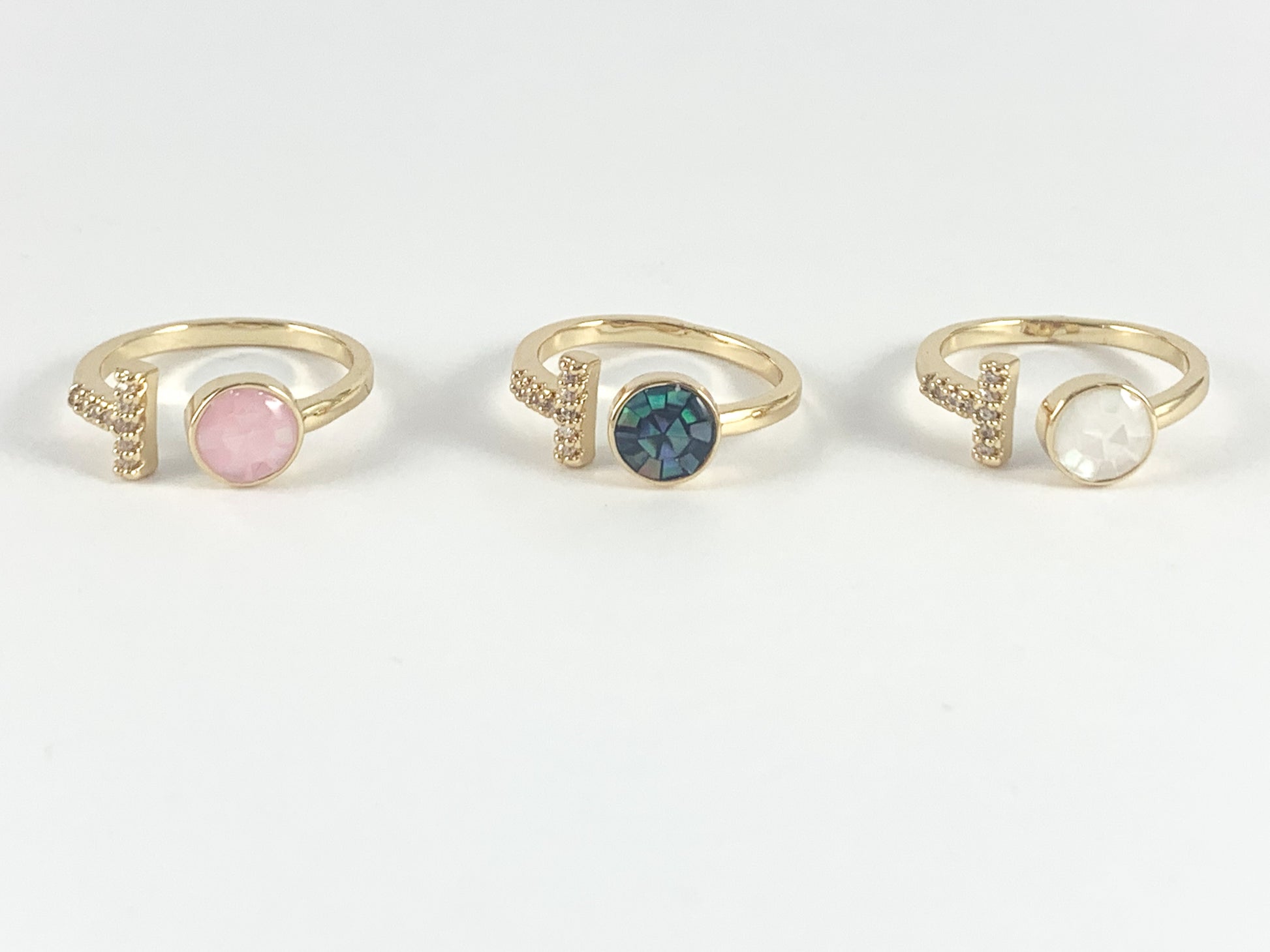 Anillo frontal abierto ajustable de concha blanca rosada en forma de T de concha de abulón en cobre chapado en oro real de 18 quilates, 5 piezas