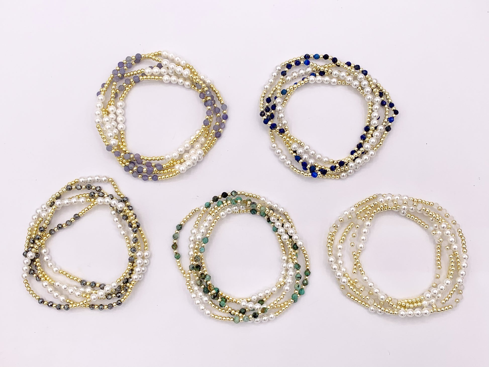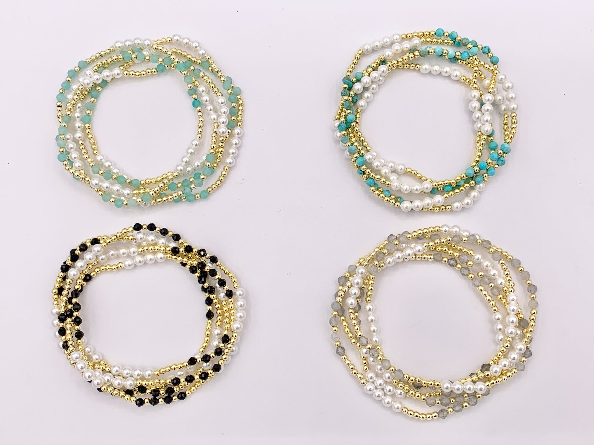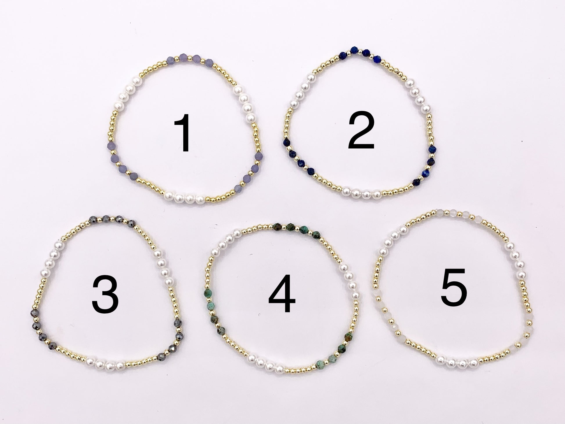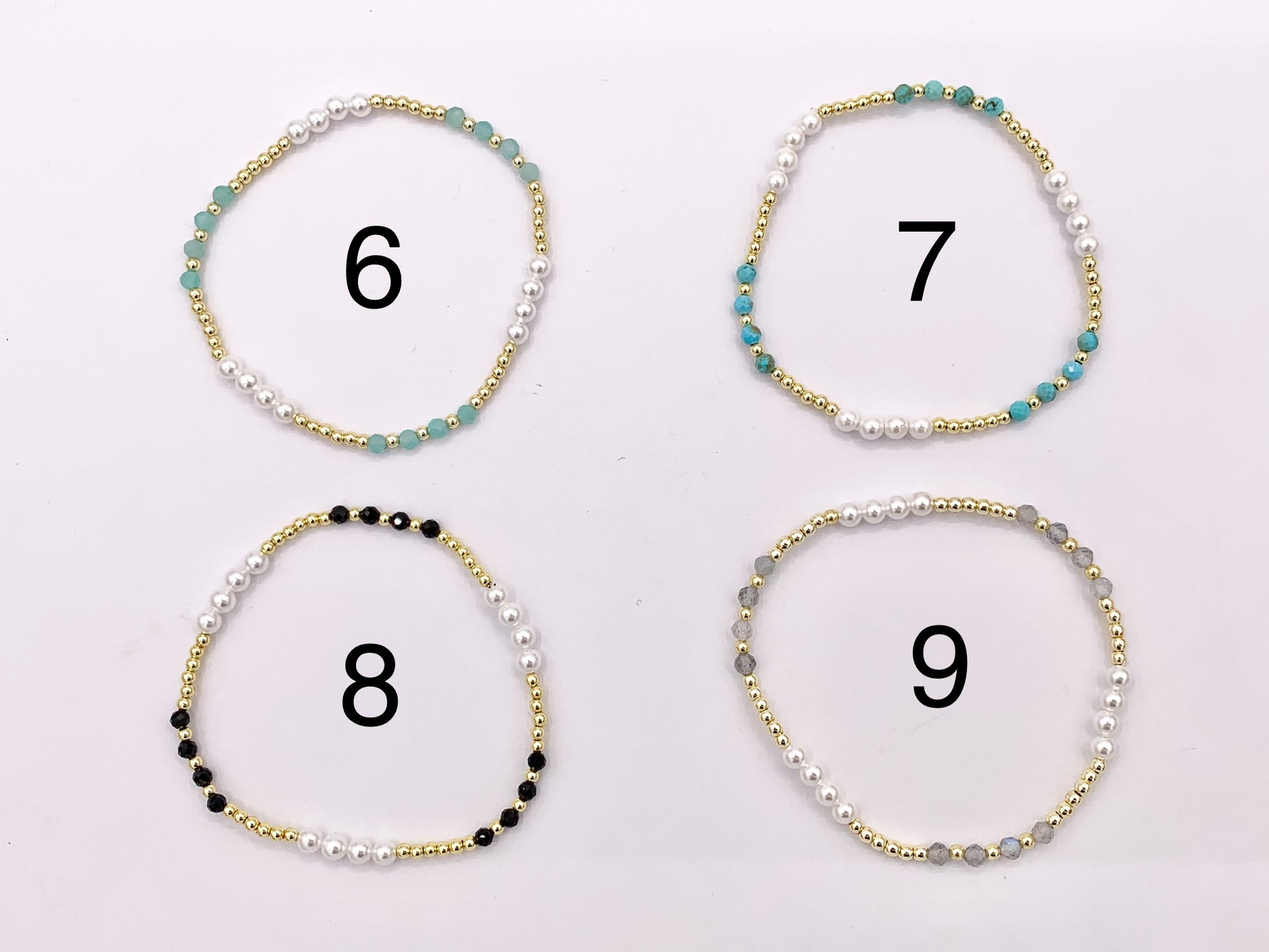 Assorted Stones With Pearls Dainty Stackable Stretchy Bracelet 1 piece Black Spinel, Terahertz, African Turquoise, Magnesite And More 7"
