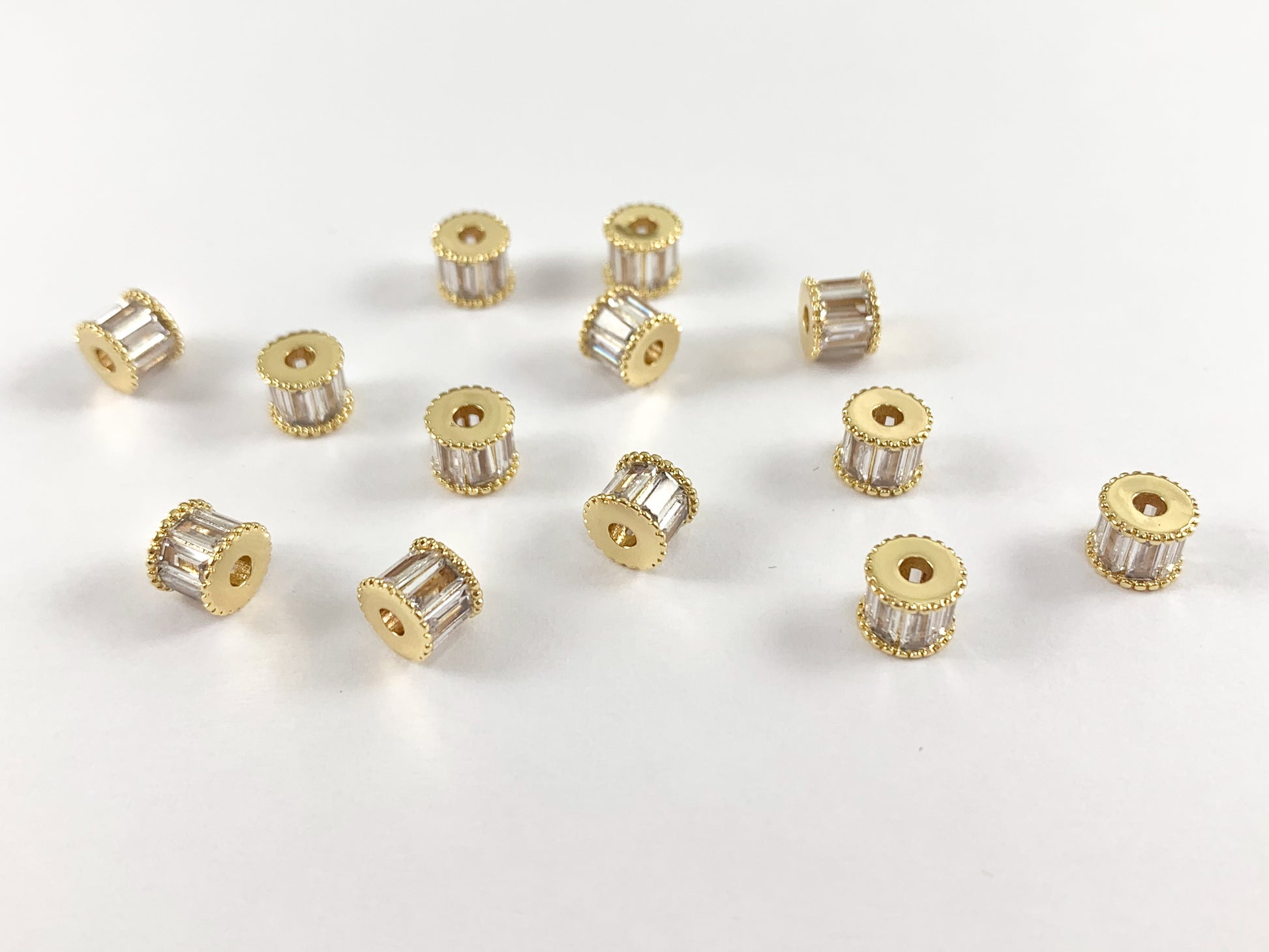 Cuentas espaciadoras de baguette | Micro CZ chapado en oro real de 18 quilates pavimenta pequeñas cuentas espaciales de barril sobre latón para la fabricación de joyas, 8 piezas