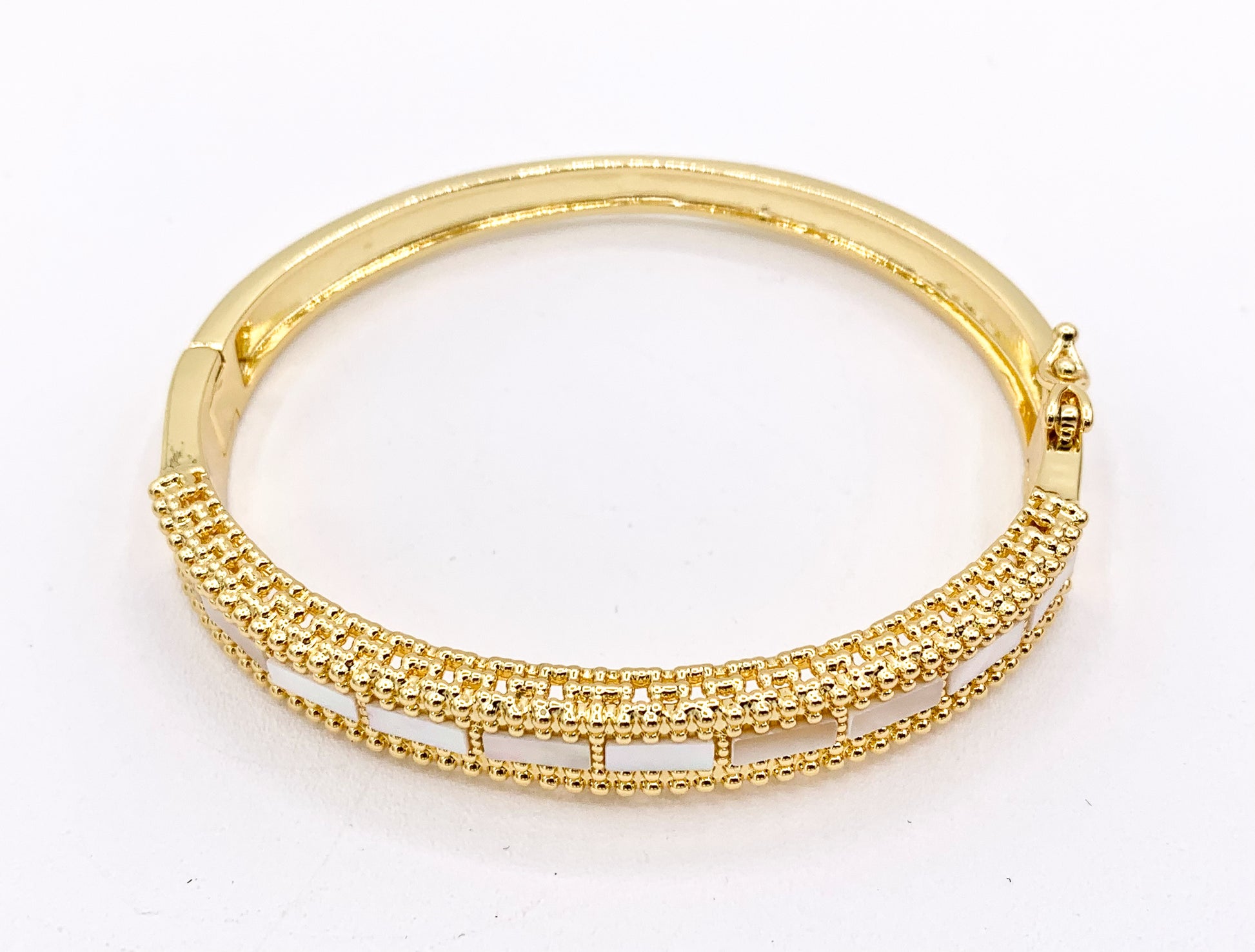 Beautiful White Shell Bracelets in Real Gold 18K Plated Copper Fancy Push Open Snap Bracelets. Please push down on the opening and pull open. Don't pull directly it will not budge.