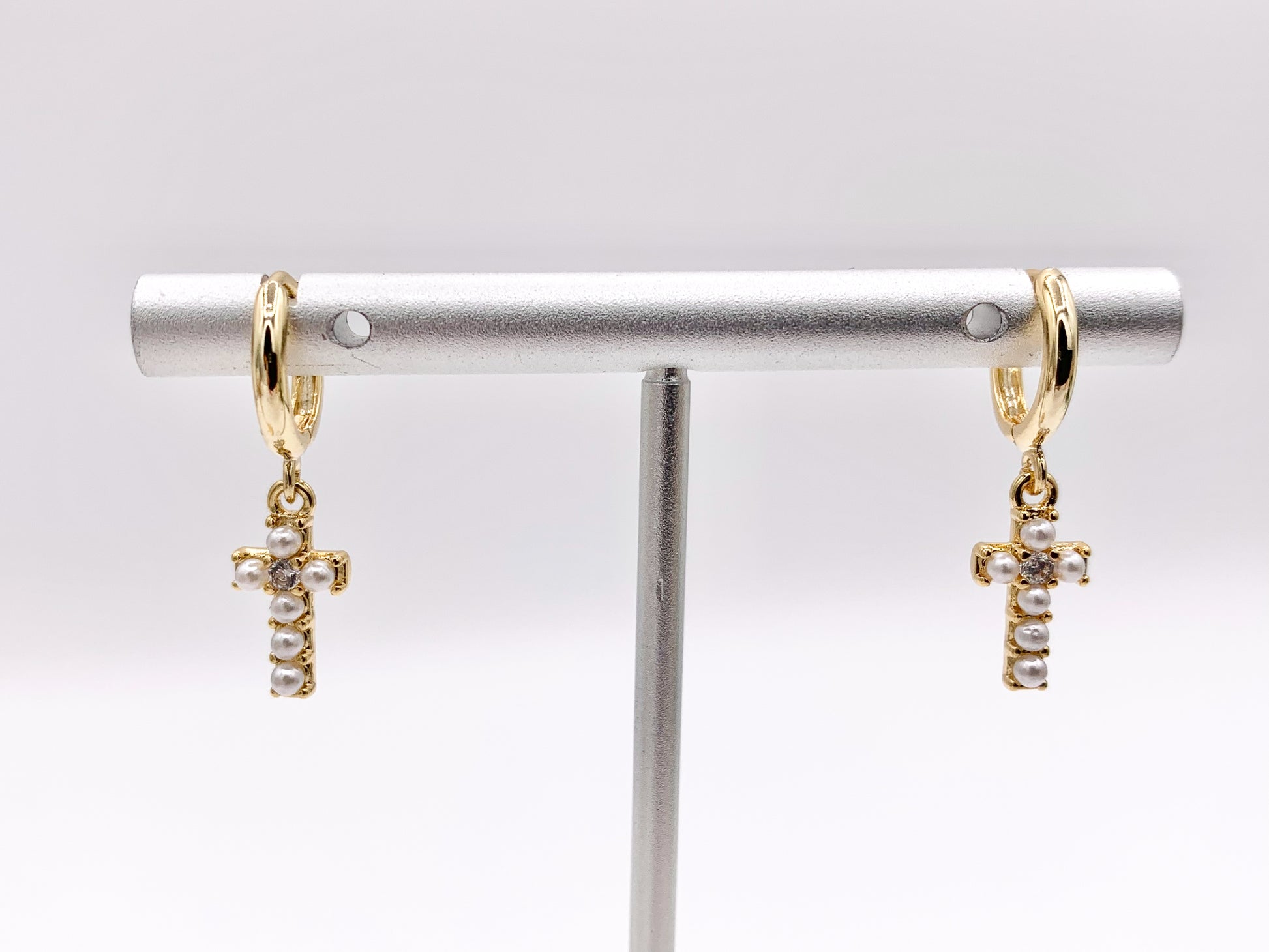 Cute Dangle Pearl Cross Huggie Earrings with CZ Pave in 18K Gold Plated Copper