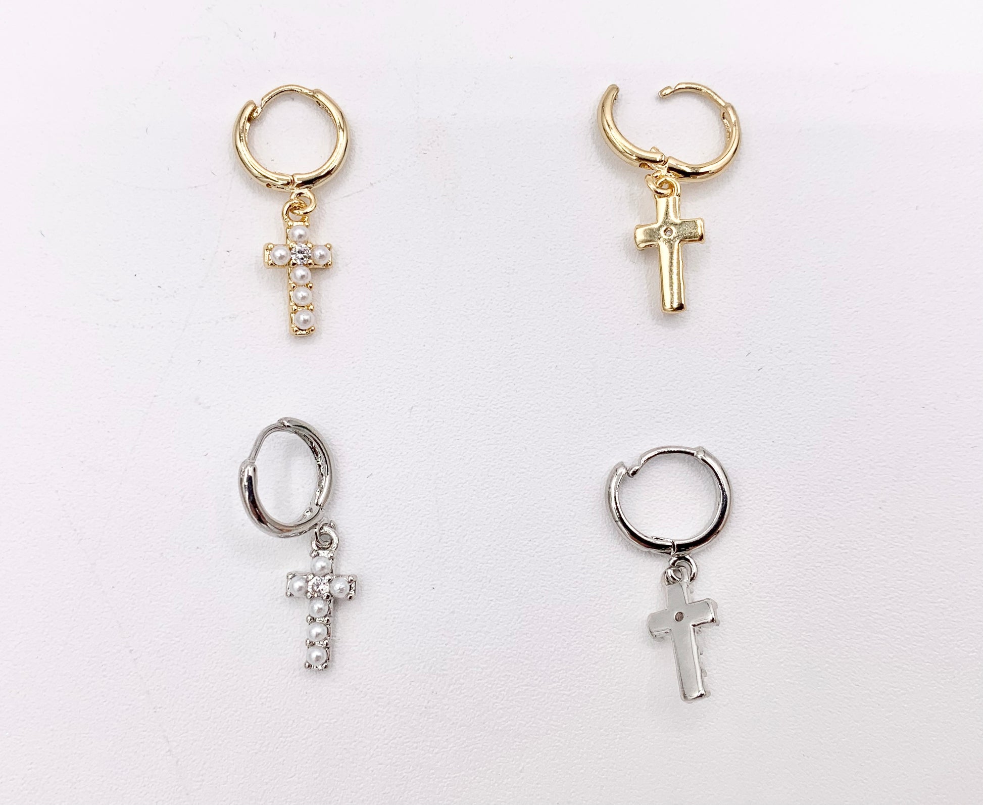 Cute Dangle Pearl Cross Huggie Earrings with CZ Pave in 18K Gold/Platinum Plated Copper 4 PAIRS