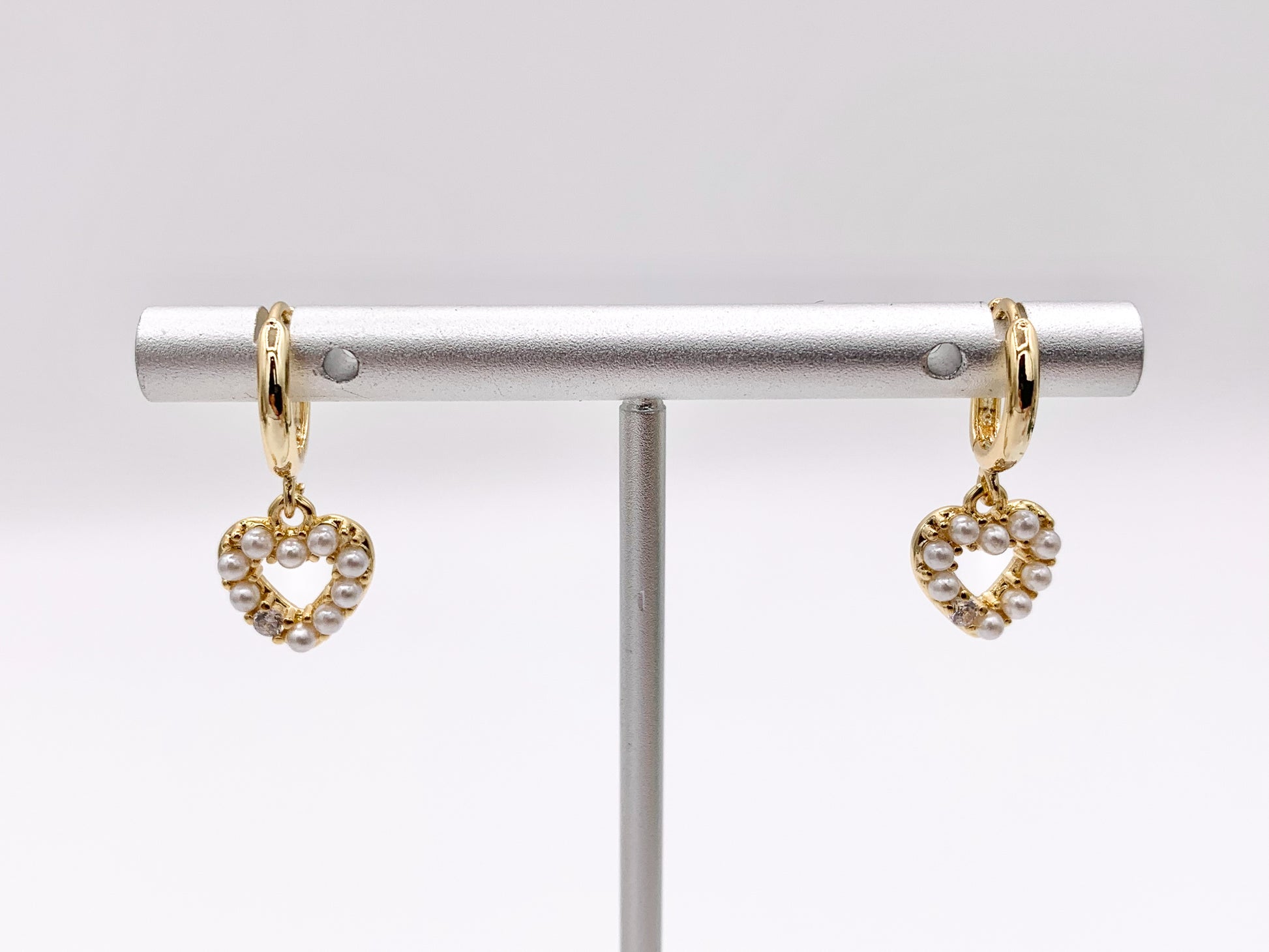 Cute Dangle Pearl Heart Huggie Earrings with CZ Pave in 18K Gold Plated Copper
