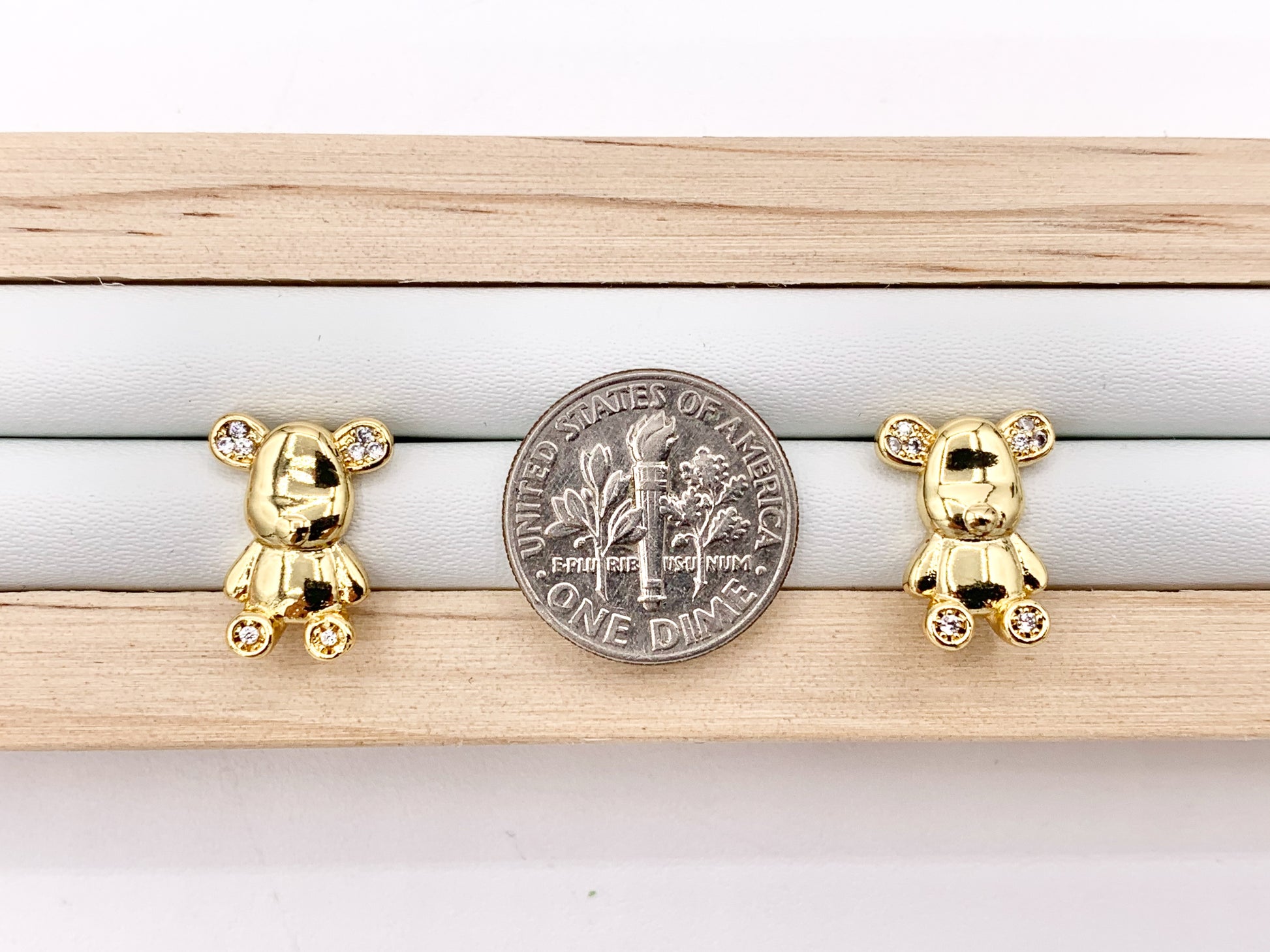 Cute Teddy Bear Earring Studs in Real 18K Gold Plated CZ Pave Over Copper 4 PAIRS