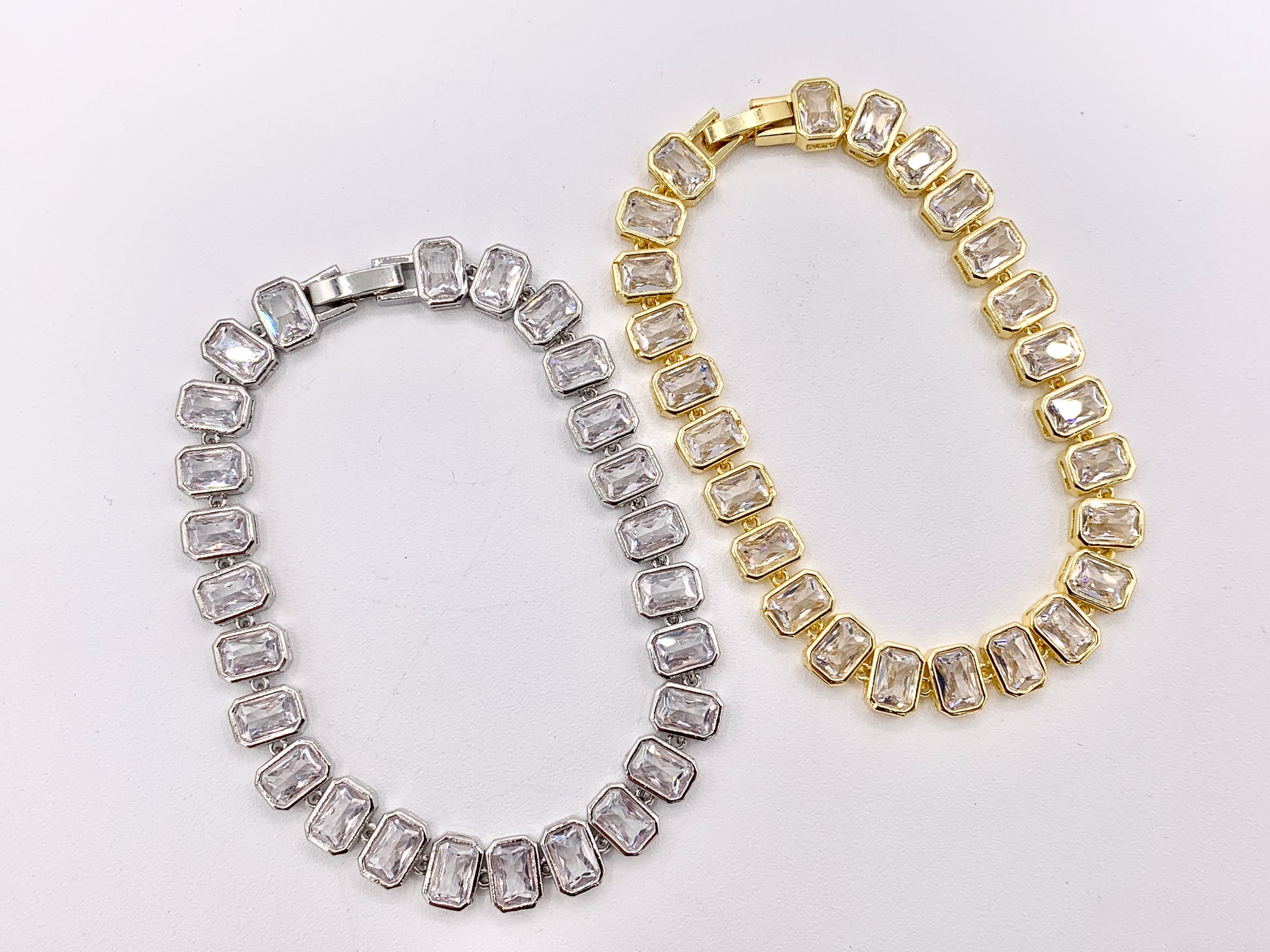 These baguette necklaces/bracelets are made with Gold plated copper.
