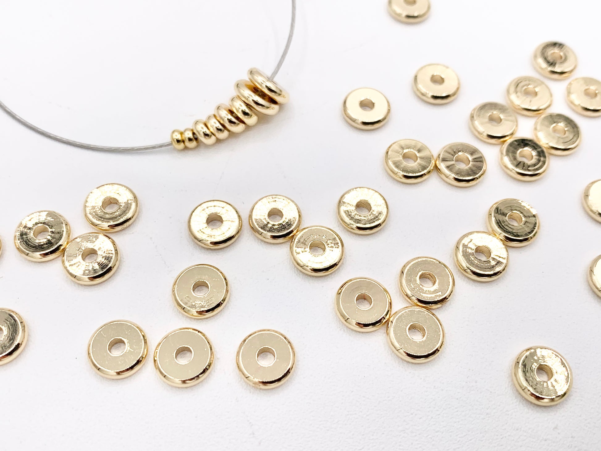 These Rondelle Spacers/Beads are real gold 18k plated with a copper base. These can be wonderful made into bracelets, necklaces, earring, and even used for crafts.