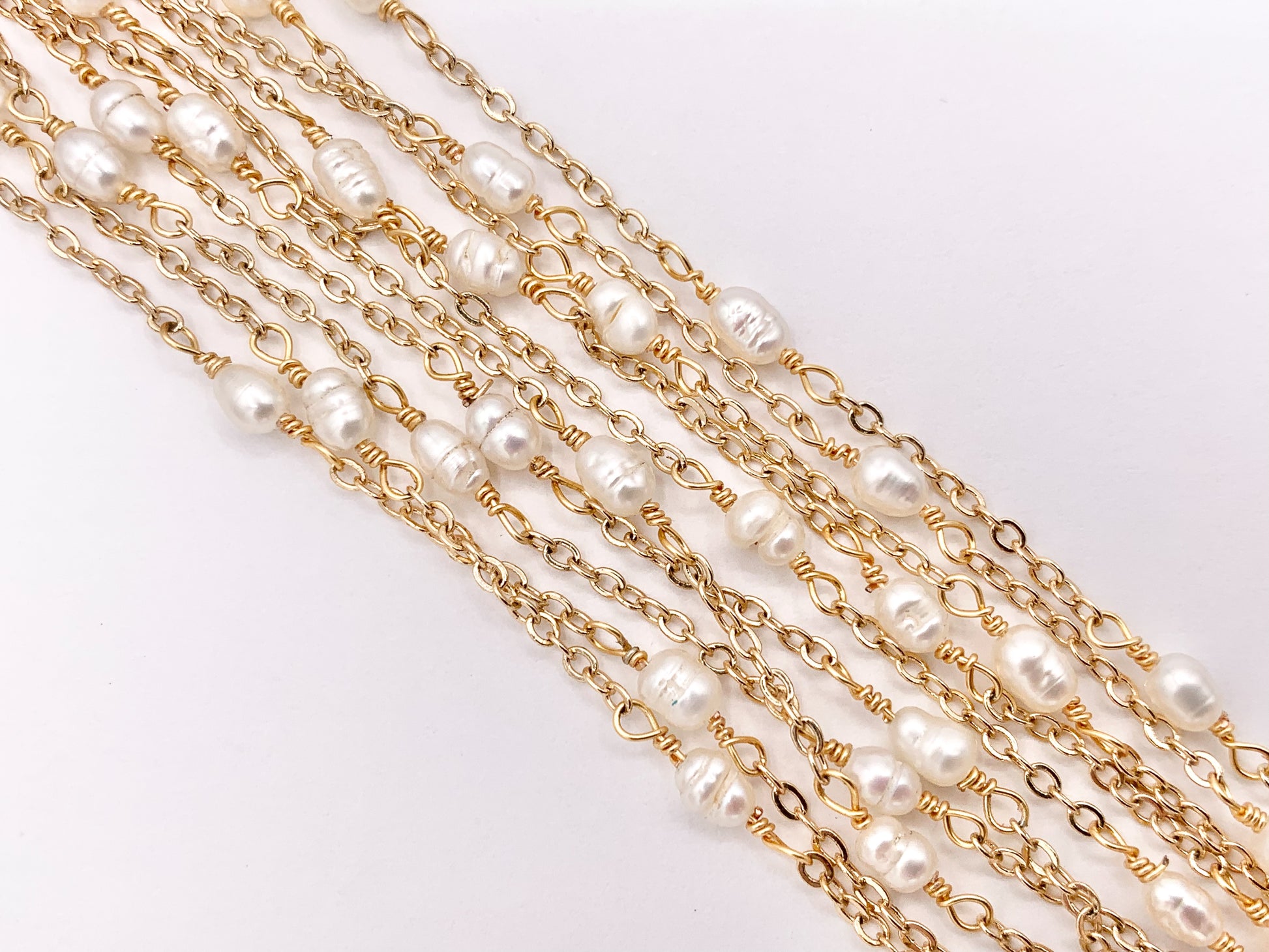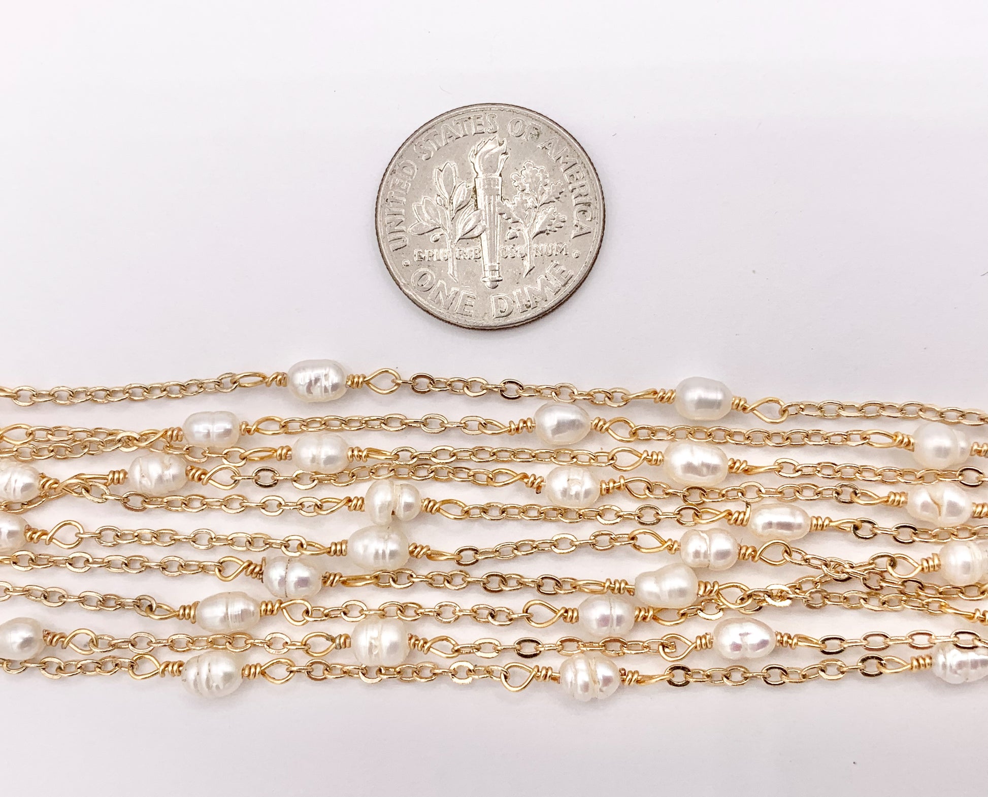 Dainty White Rice Shape Freshwater Pearl Wired Chain in Real Gold 18K Plated Stainless Steel By The Spool For Jewelry Making/Designs