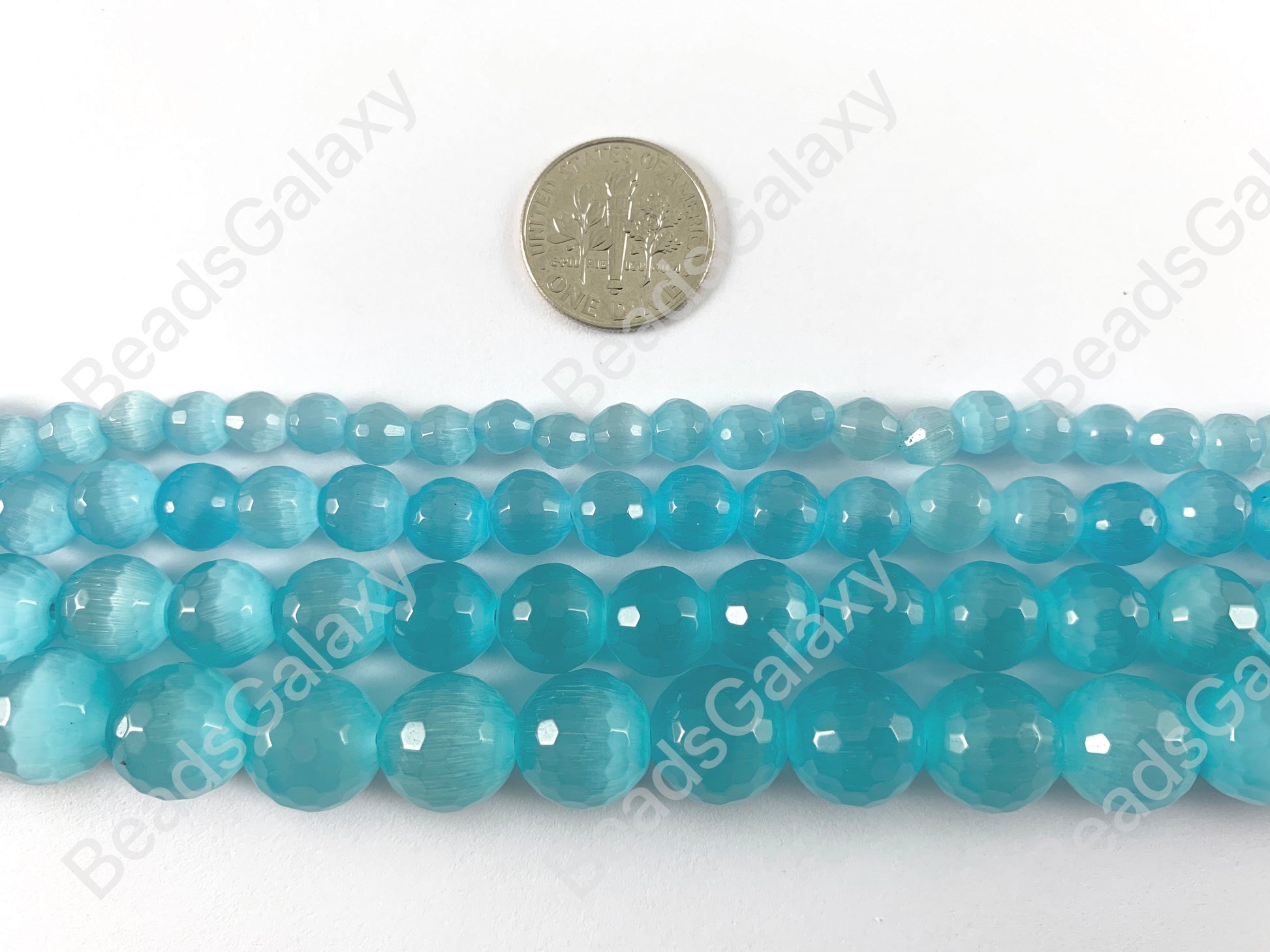 Cuentas redondas facetadas de color azul agua teñidas con ojo de gato de alrededor de 15"
