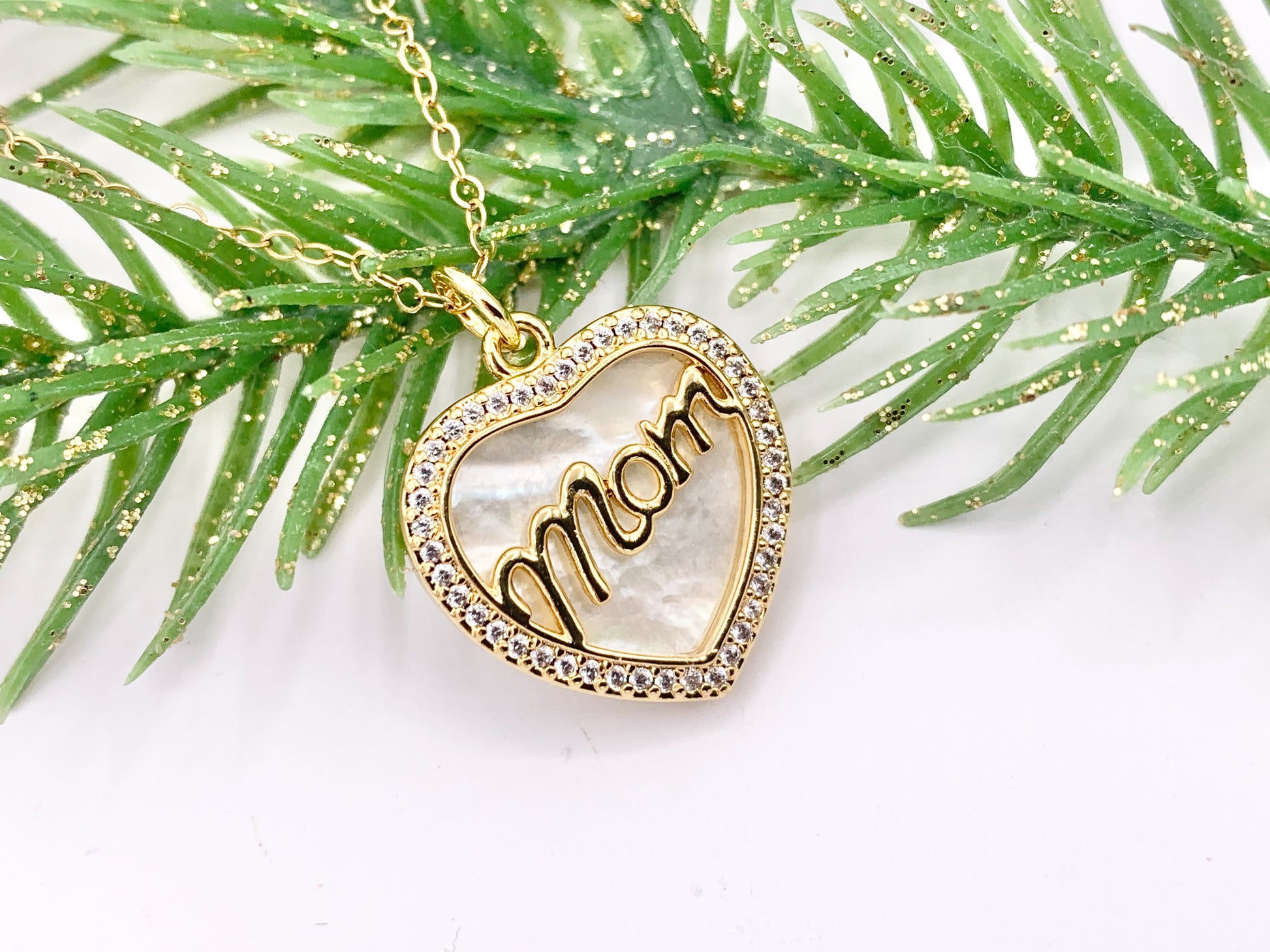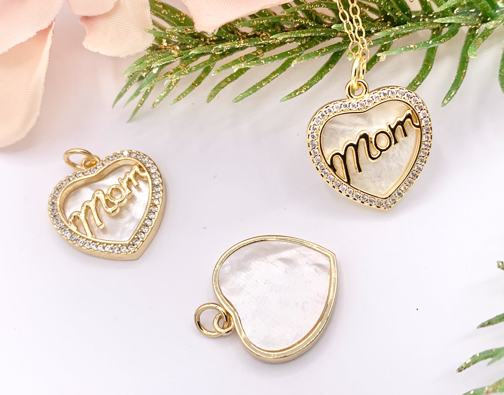 Mother of Pearl CZ Pave Heart Pendant with MOM Letters Charm in Real Gold 18K Plated Over Brass 5 PCS