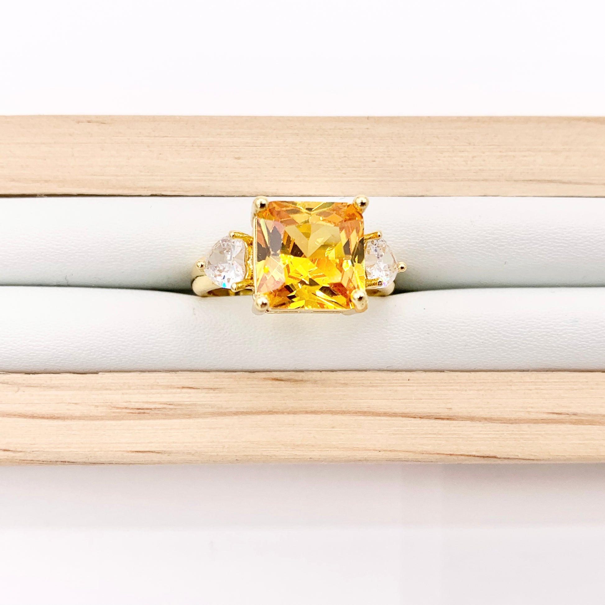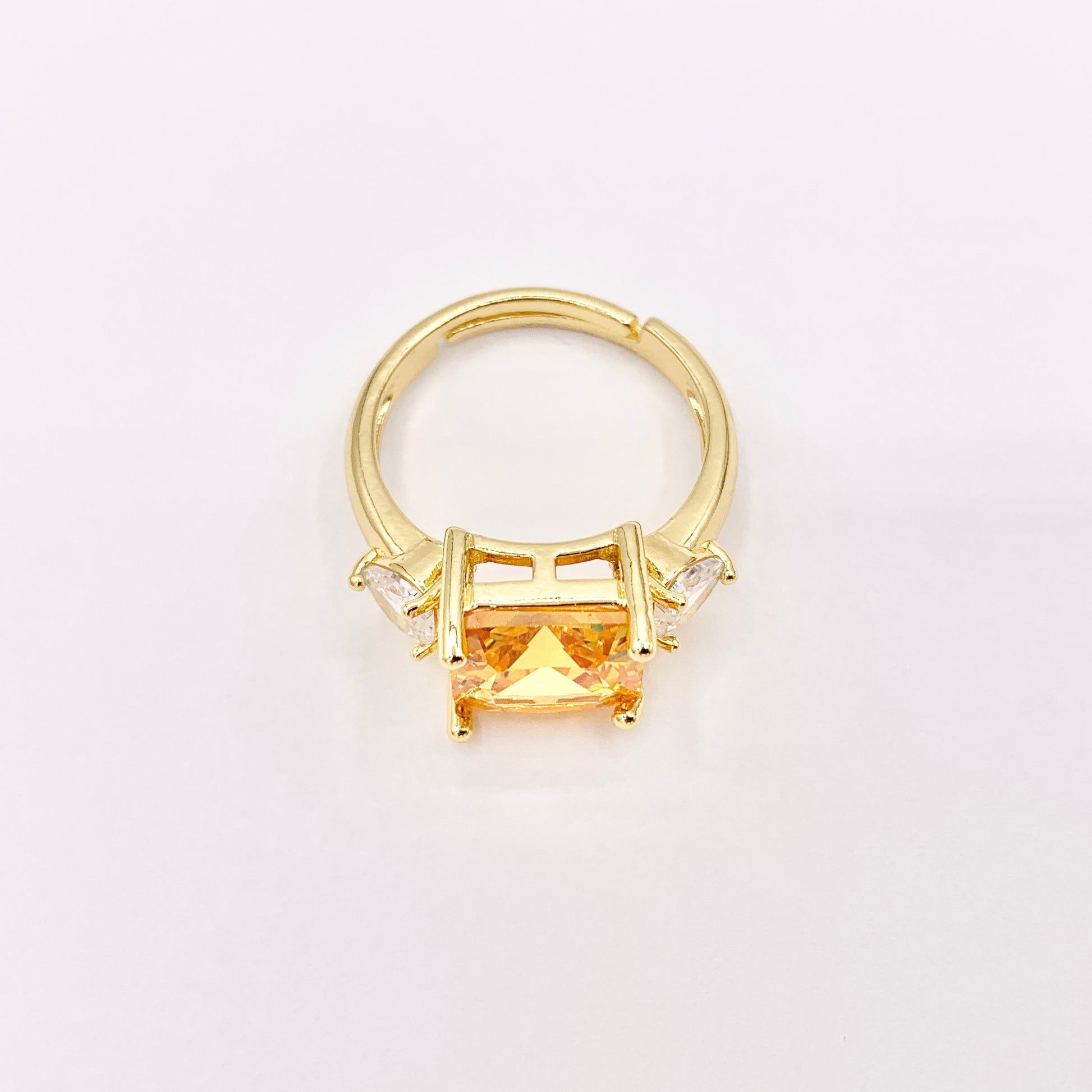 Radiant Princess Cut Square Ring in CZ Pave Orange Rhinestone Side Hearts Adjustable Rings in 18K Gold Plated Copper
