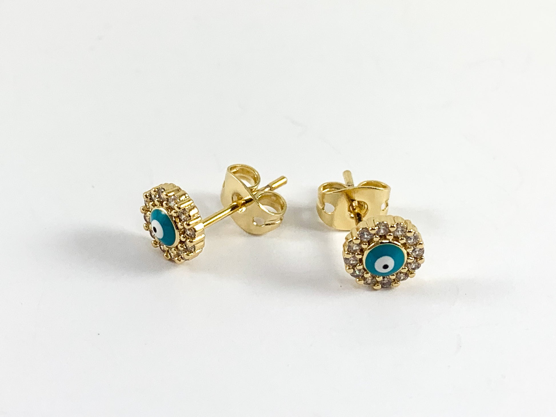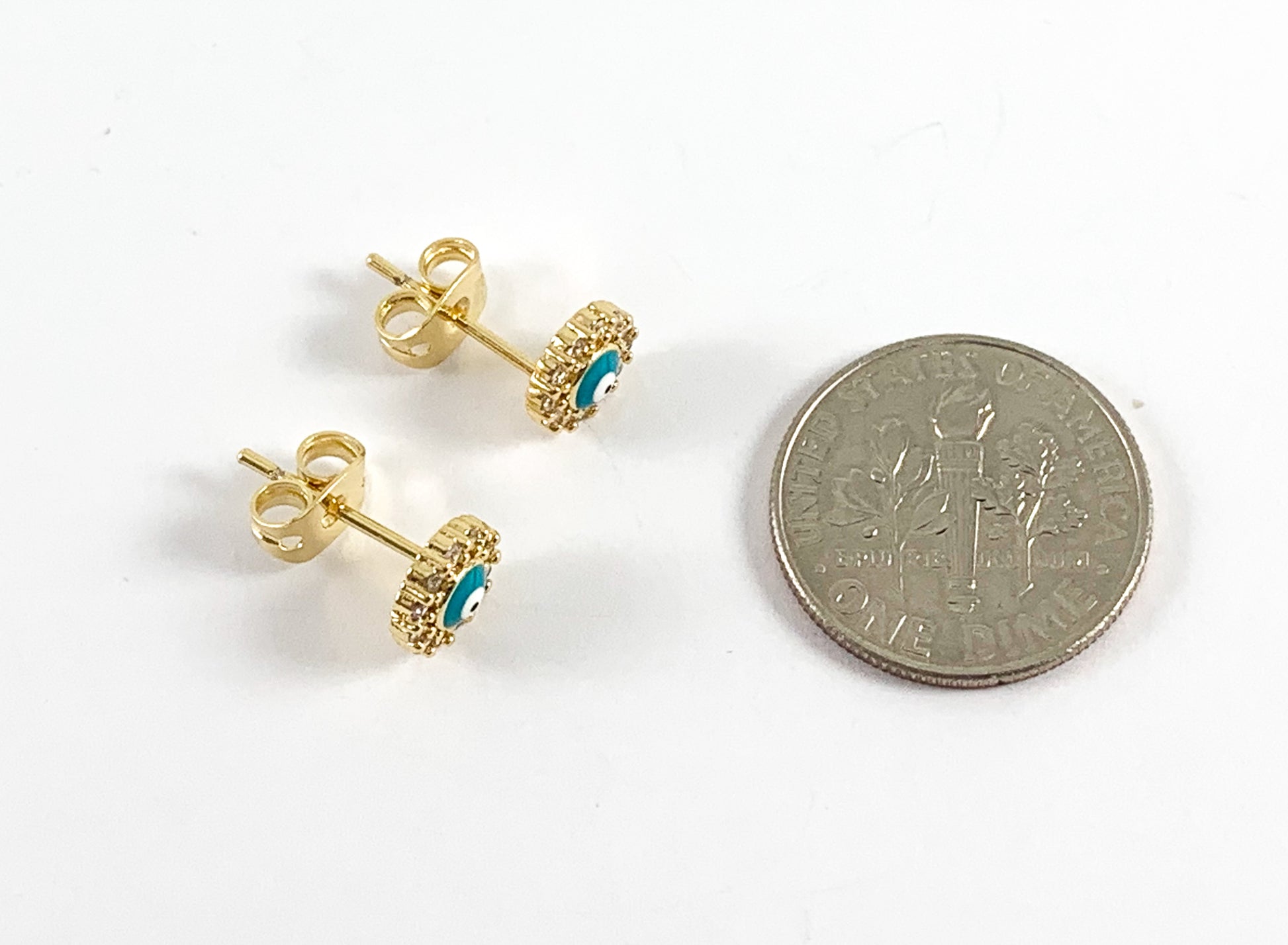 Pendientes de tuerca con pavé de circonita cúbica esmaltada de oro real de 18 quilates, color turquesa, con pavé de mal de ojo, sobre latón, 5 pares