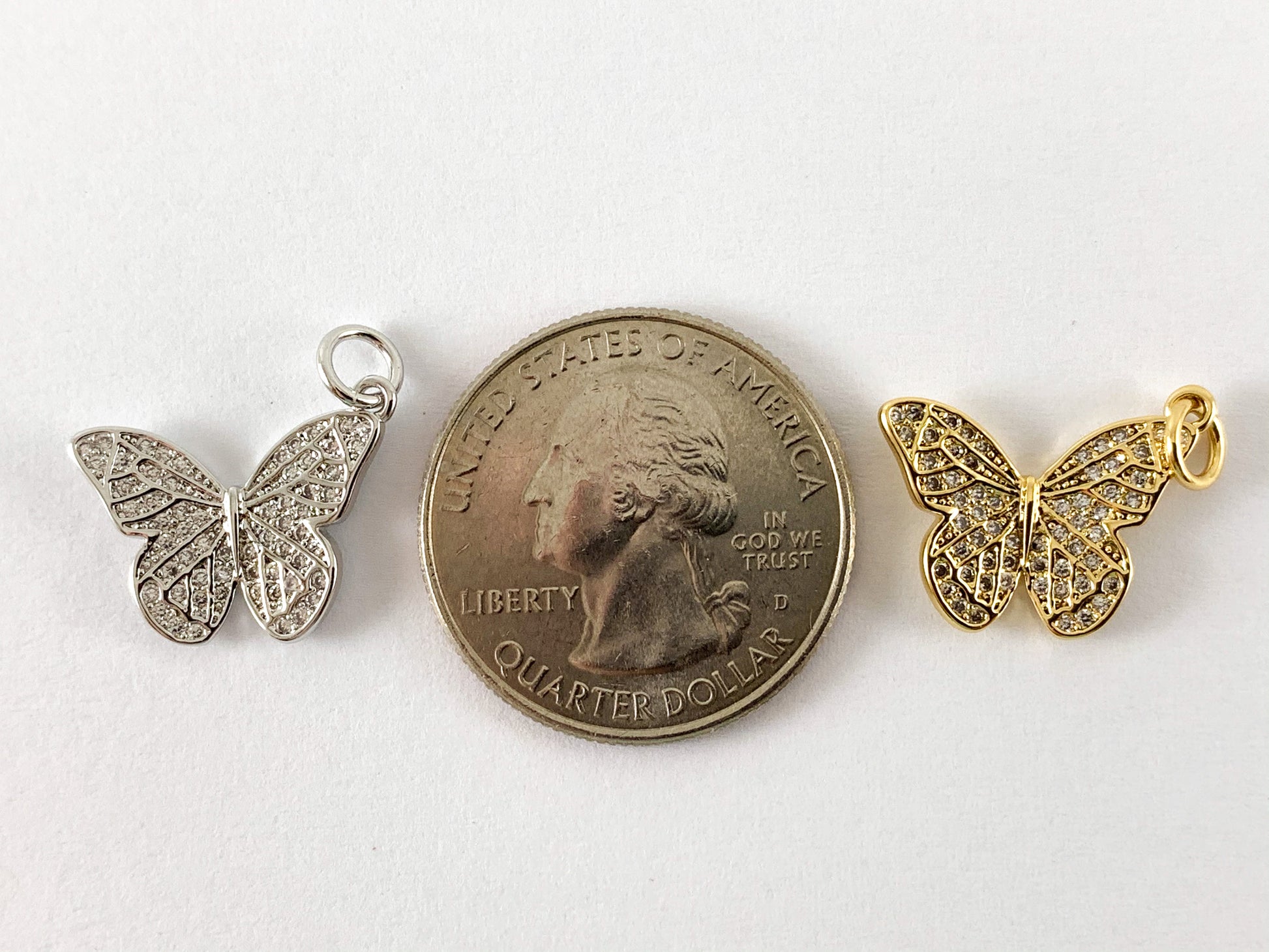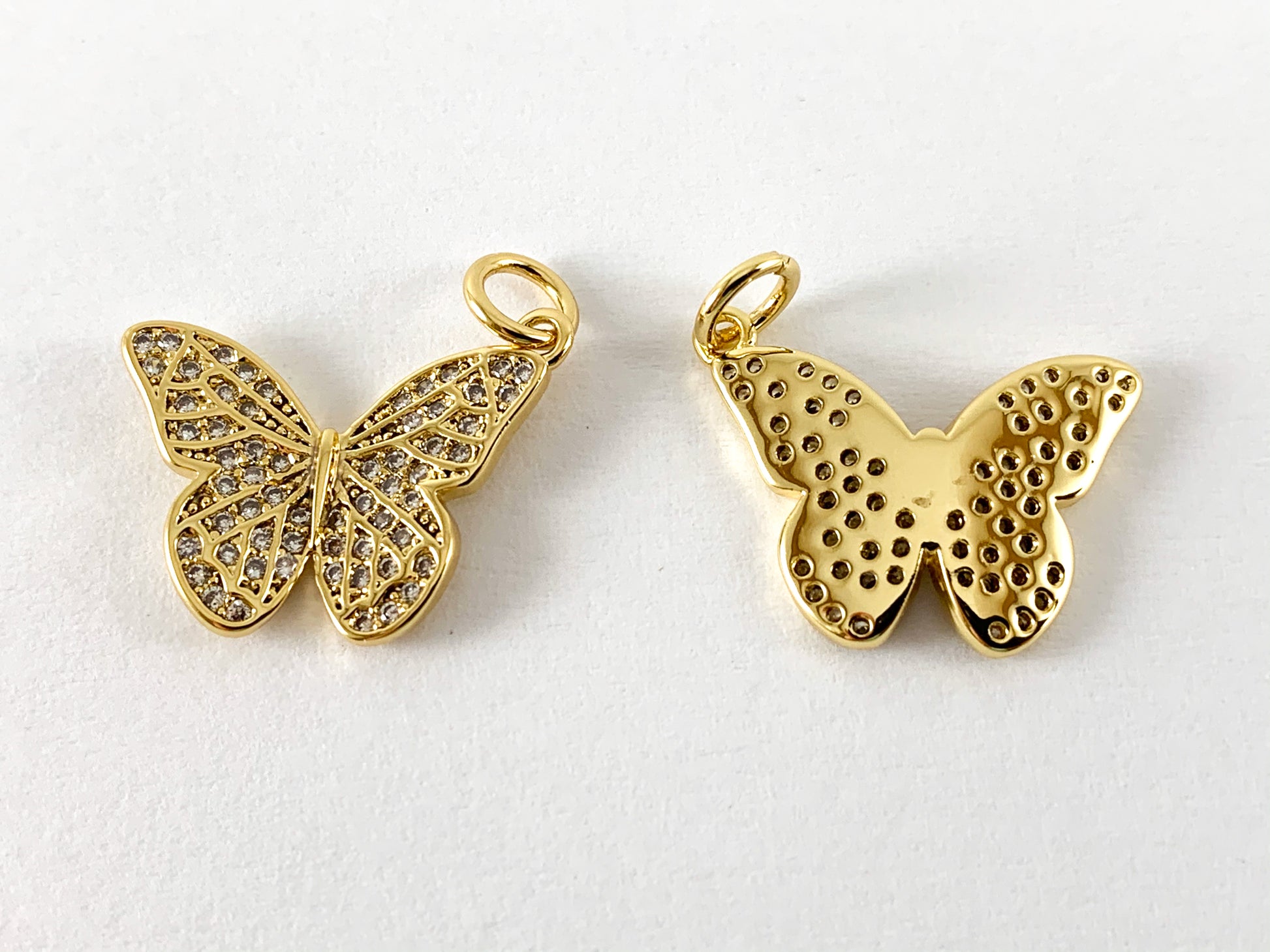 Encantos de mariposa pavimentados con circonita cúbica chapados en oro real de 18 quilates sobre latón, 4 piezas