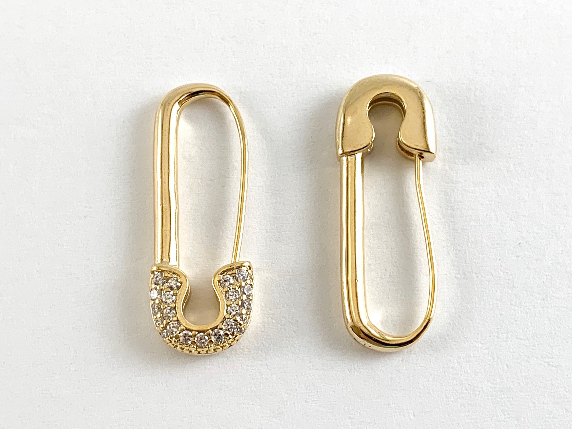 Estos colgantes únicos con forma de imperdible están chapados en oro real de 18 quilates con una base de latón.
