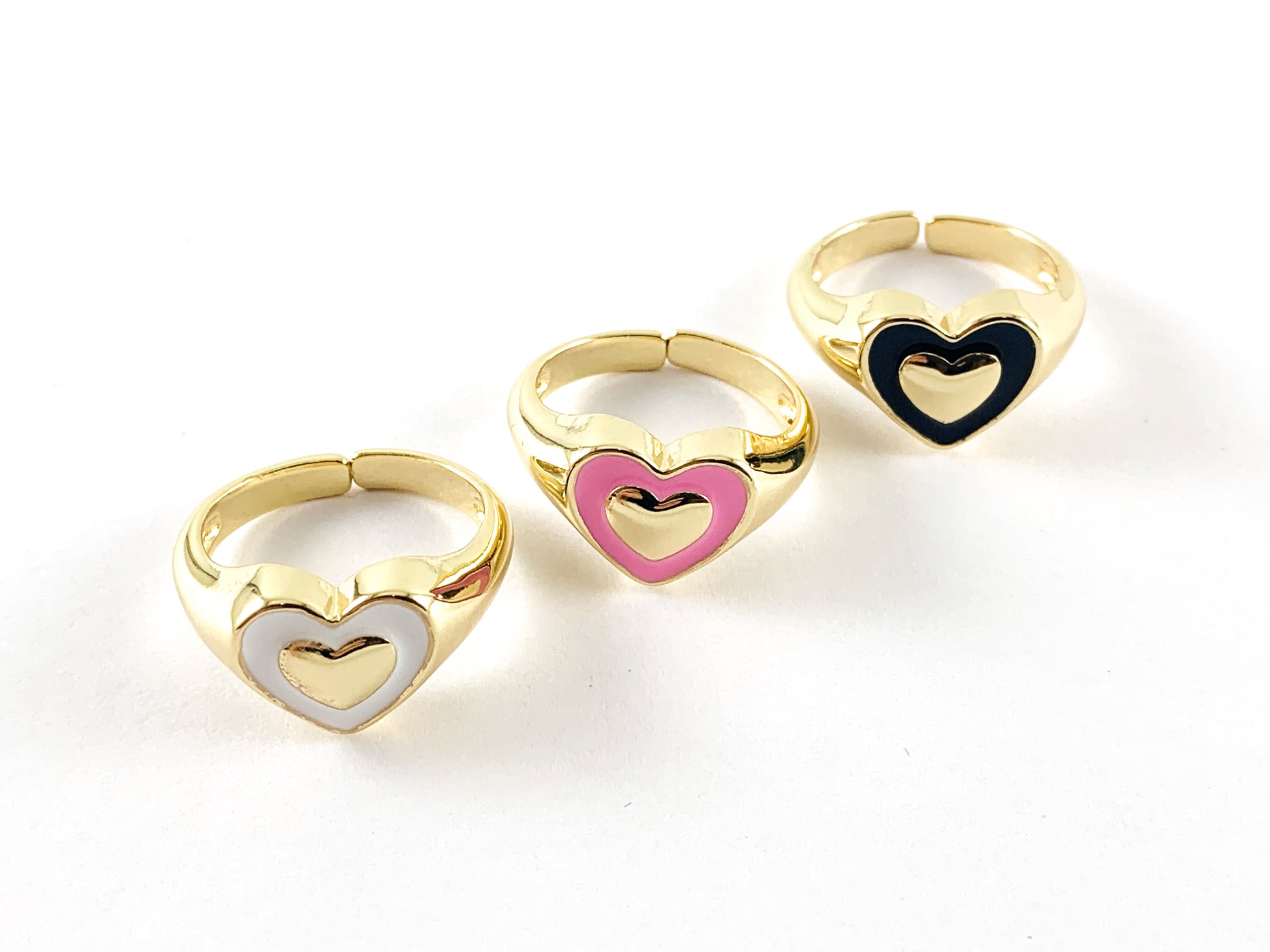 Estos fantásticos anillos con esmalte en forma de corazón están chapados en oro real de 18 quilates y tienen una base de latón. Son únicos y hermosos. ¡Definitivamente llamaría la atención de todos!