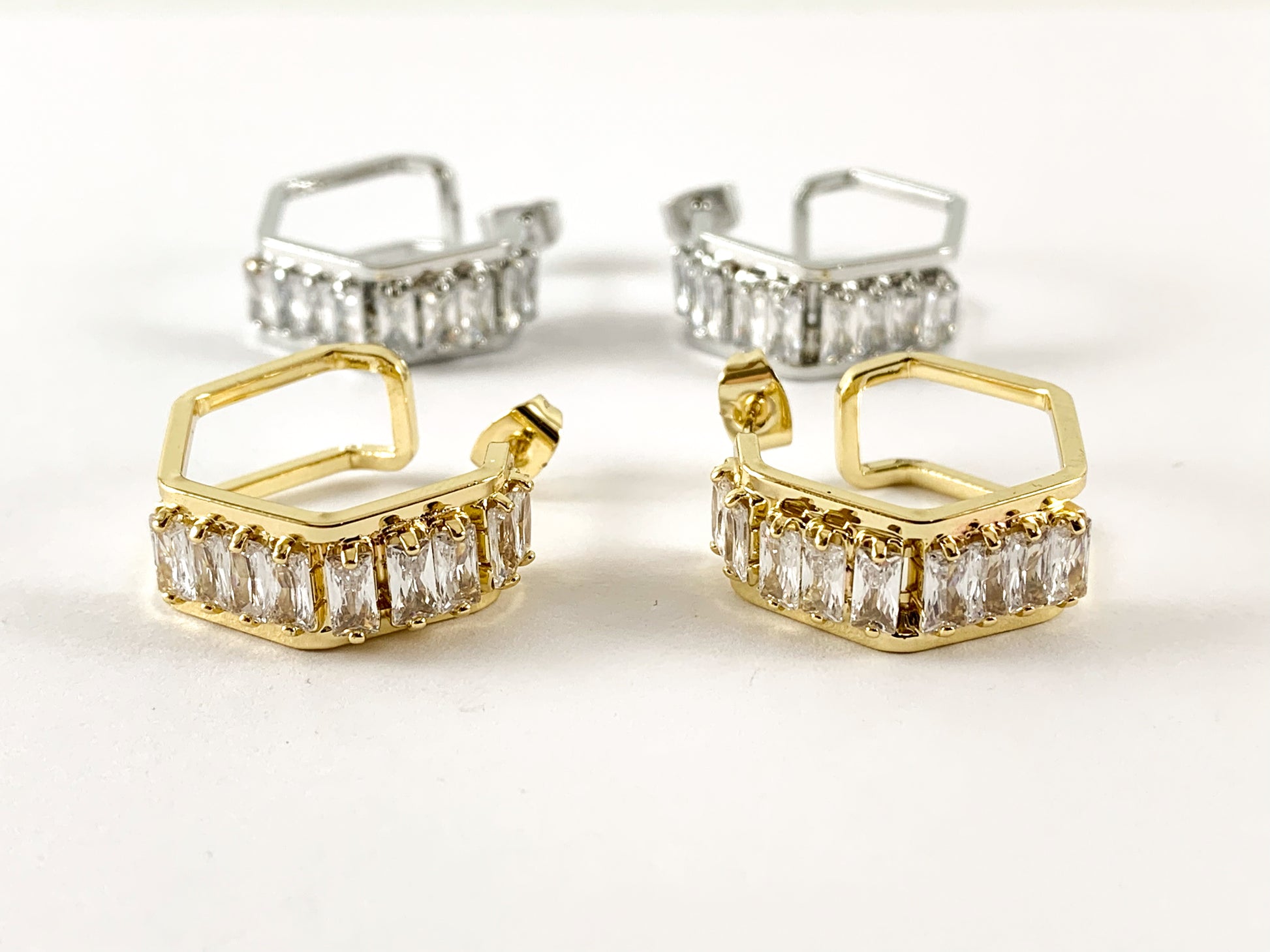 Pendiente hexagonal de latón con pavé de circonita chapada en oro real/platino de 18 quilates, 3 pares