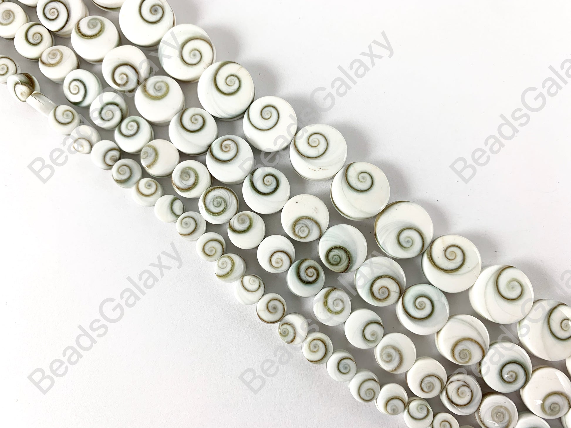 Como ocurre con muchas conchas, el ojo de Shiva está hecho de carbonato de calcio. Aunque el color de su cuerpo es siempre blanquecino, su hermoso remolino puede variar de color dependiendo de la dieta del caracol. Debido a que se trata de cuentas naturales, tenga en cuenta que cada hebra puede mostrar una ligera variación en tamaño, color y patrón. ¡Apreciamos su comprensión!