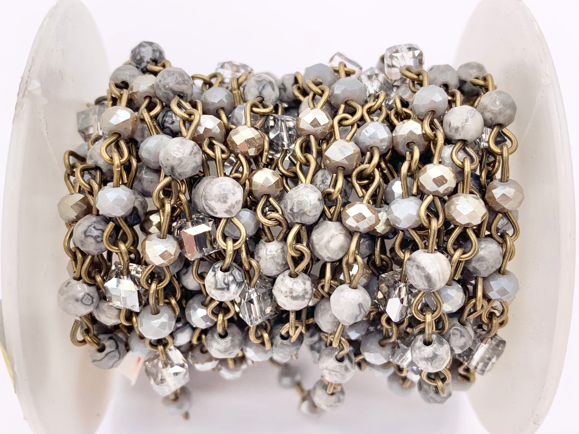 Silver Crazy Lace Agate Round Faceted + Crystal Rosary Style Beaded Chain With Brass Wire By Spool 4mm 6mm 8mm