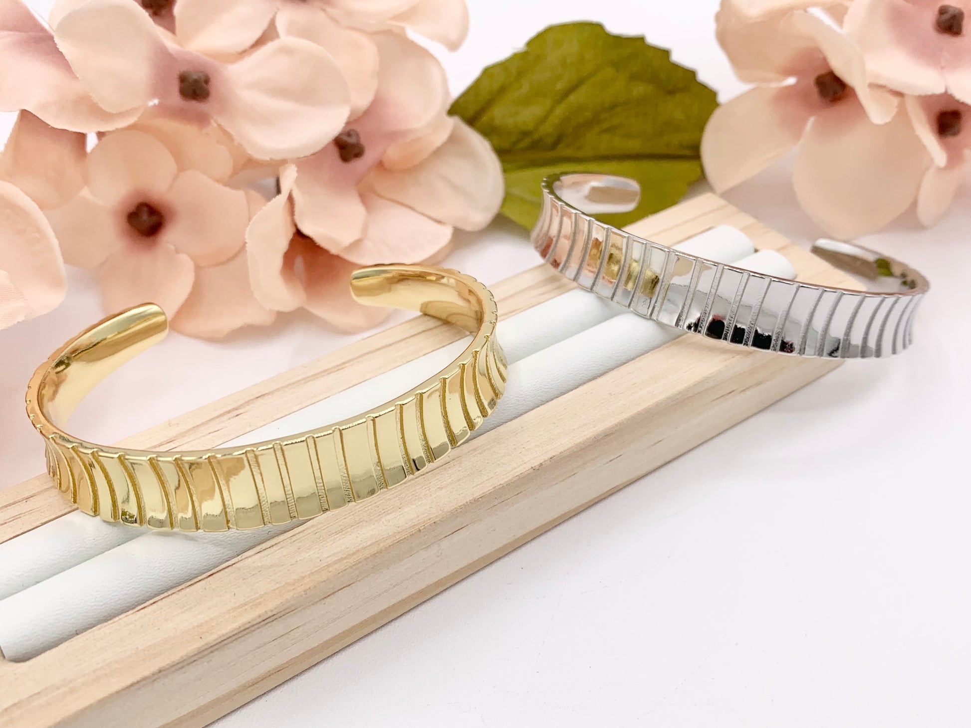 Simple Plain Vertical Stripe Textured Adjustable Bracelet Cuff in Real Gold 18K Plated Copper 2 pcs