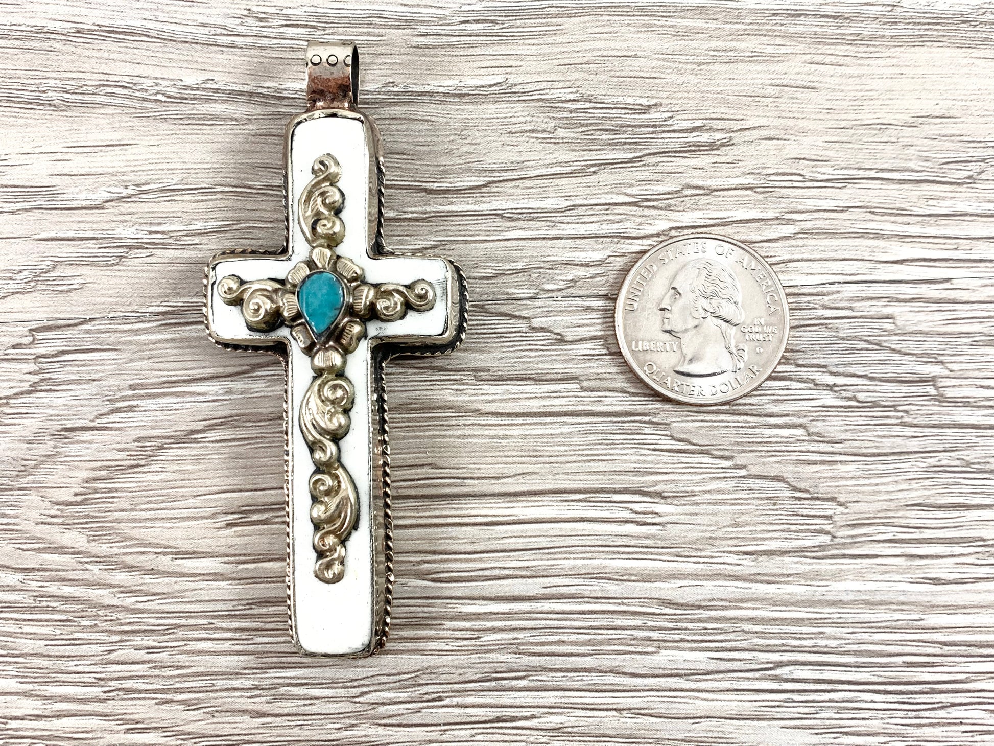 Colgante Cruz de Hueso de Plata Tibetana con Turquesa