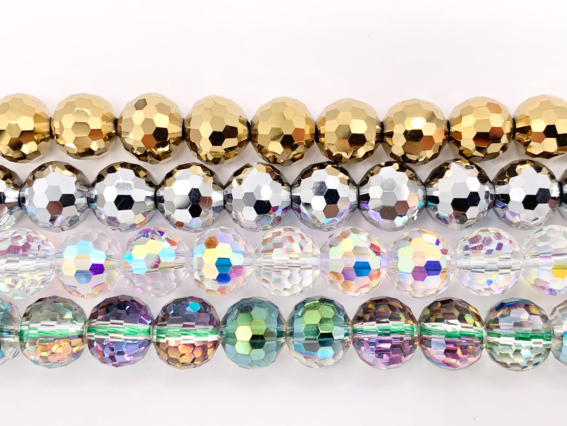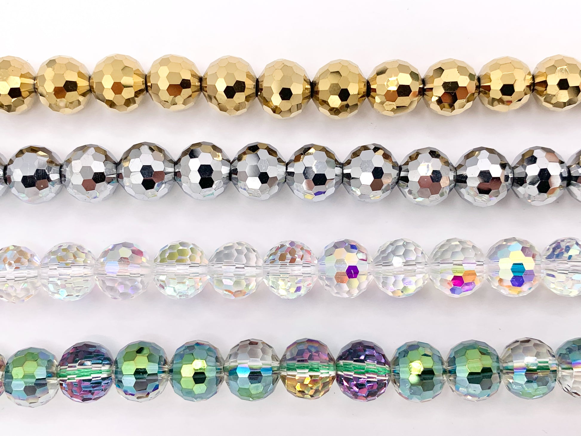 10mm High Quality Crystal Round Faceted 96 Cut Extra Shiny Crystal Beads 1 Strand 10" Available in Gold, Silver, Clear AB And Green/Purple