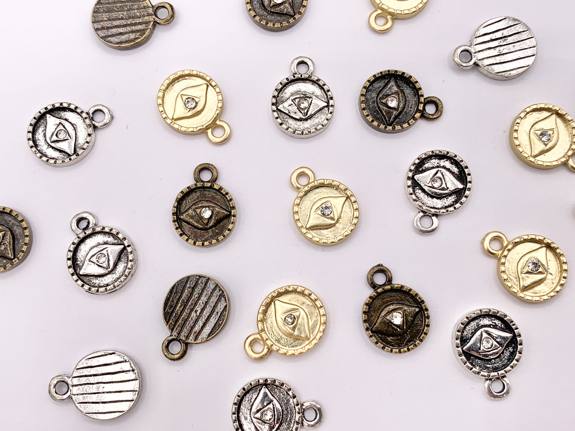 These evil eye circle charms are perfect for bracelets, necklace and any jewelry designs!