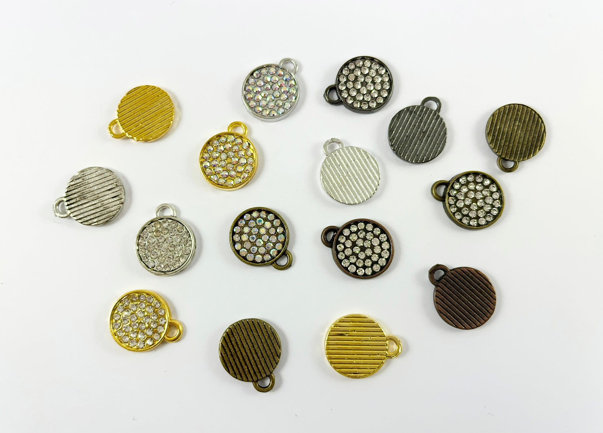13mm Pewter Rhinestone Coin Bezel 1 Loop Charm Available in Bronze, Copper, Gold, Silver and Gunmetal, Clear and Clear AB