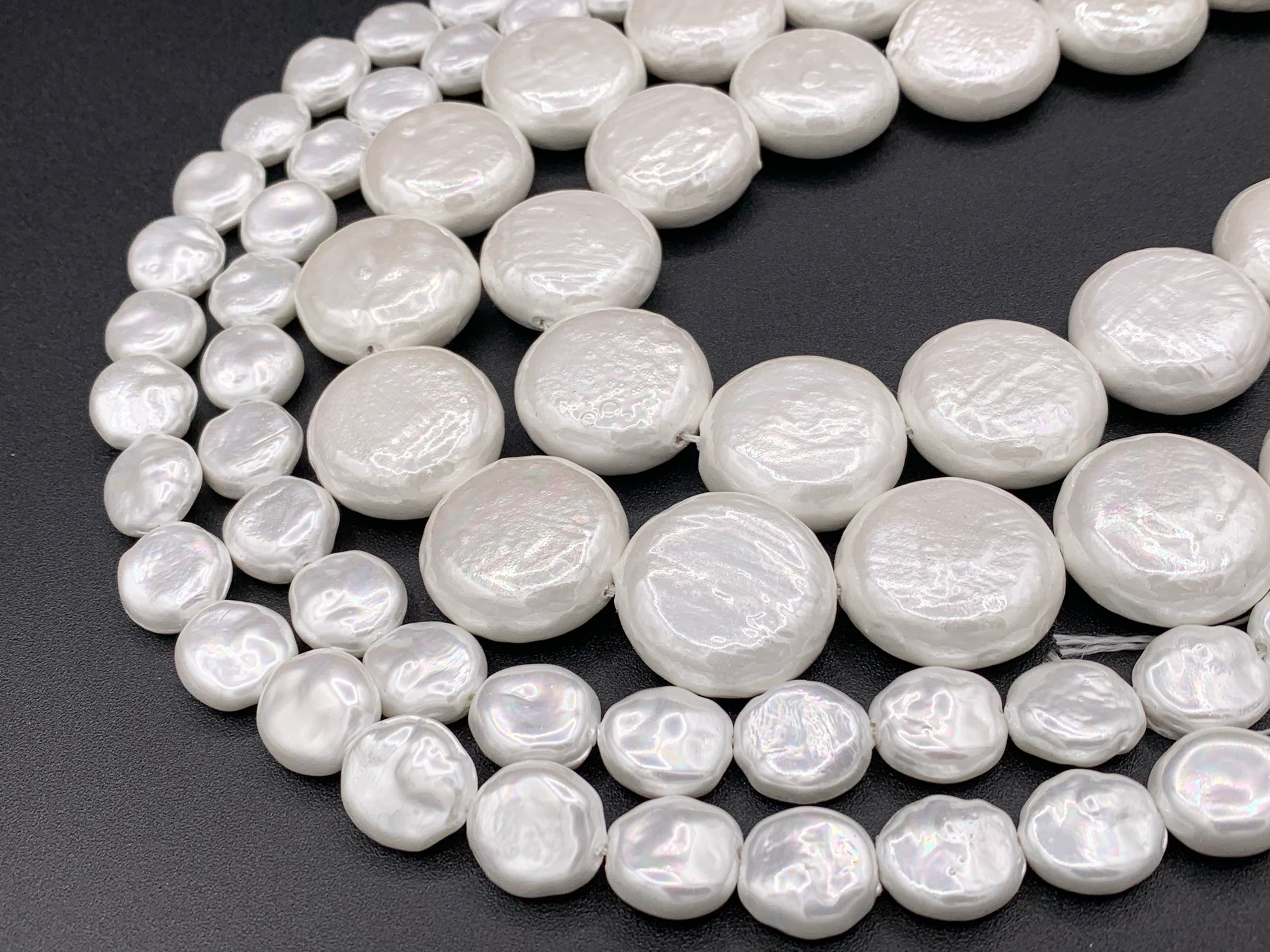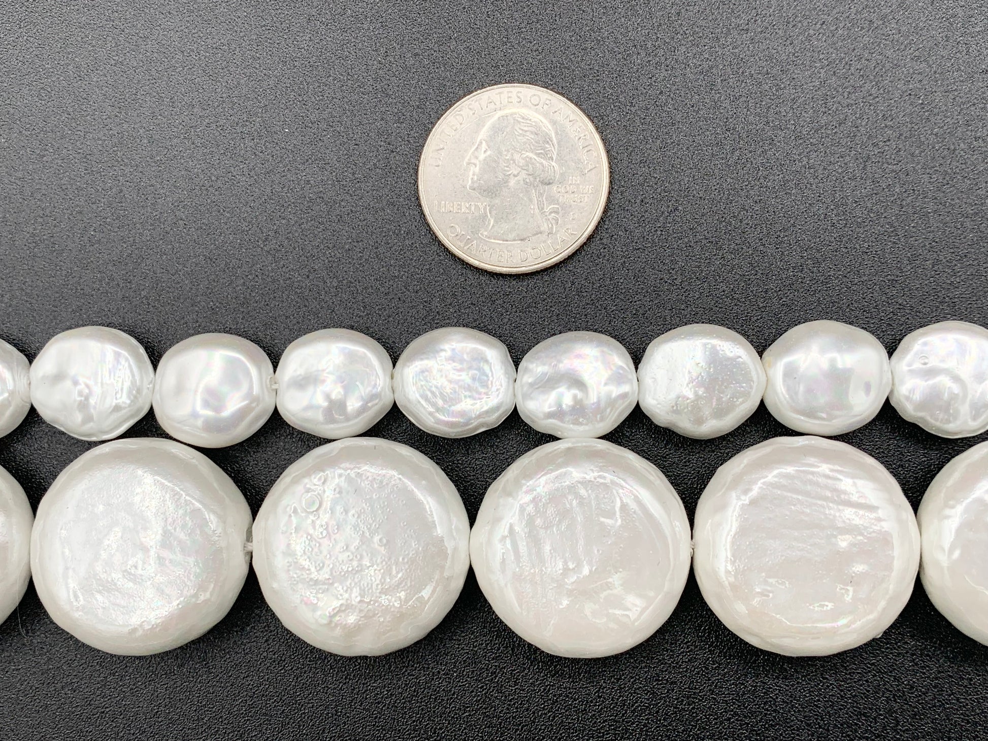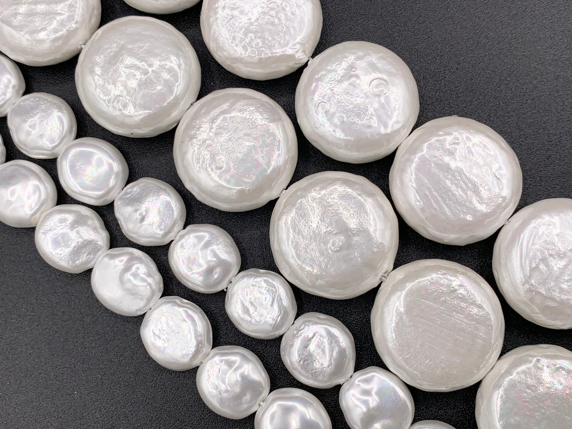 14mm & 26mm White Textured Shell Pearl Coin Beads Pearl Powder Coated Shell Beads Around 16" (1 Strand)