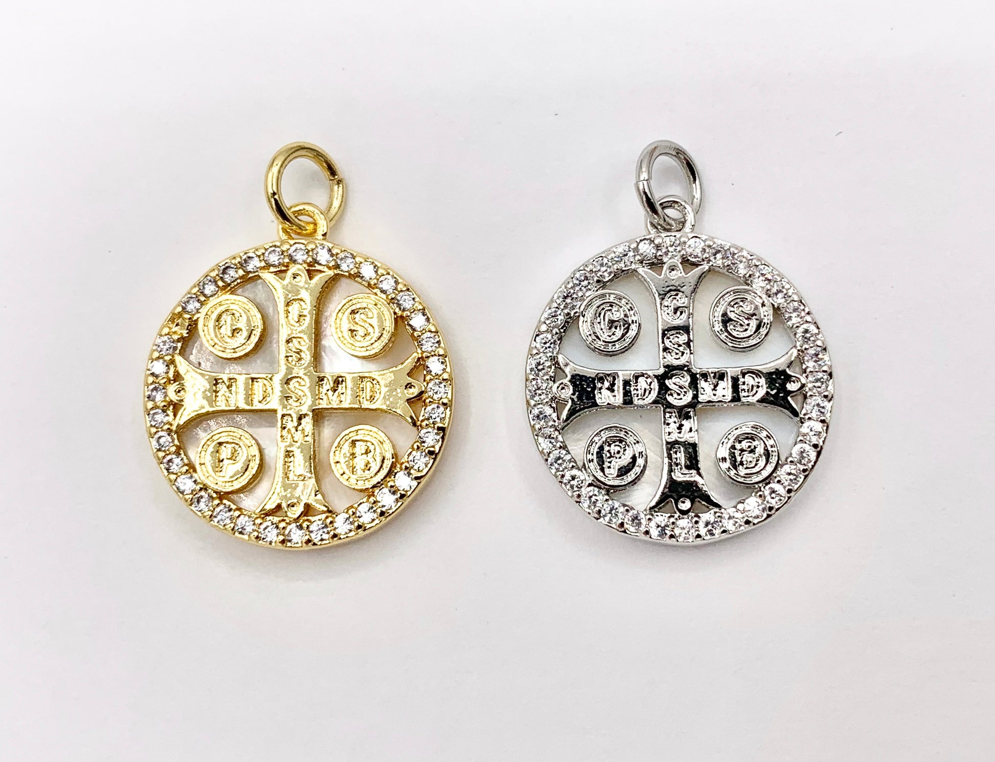 16mm Coin Cross Charm White Lip Shell St Benedict Cute Tiny Religious Pendants in 18K Gold/Silver Plated over Copper 5 PCS