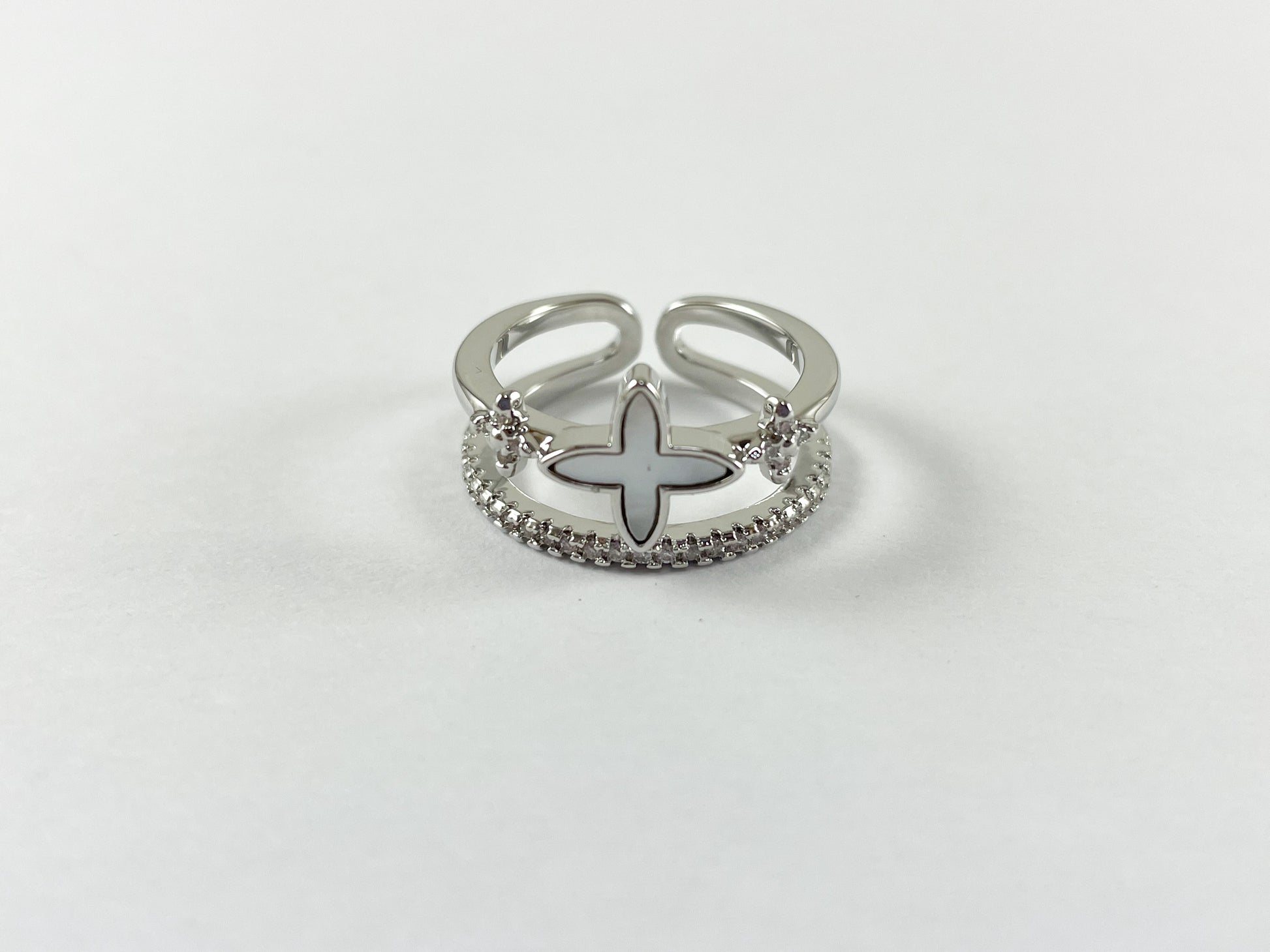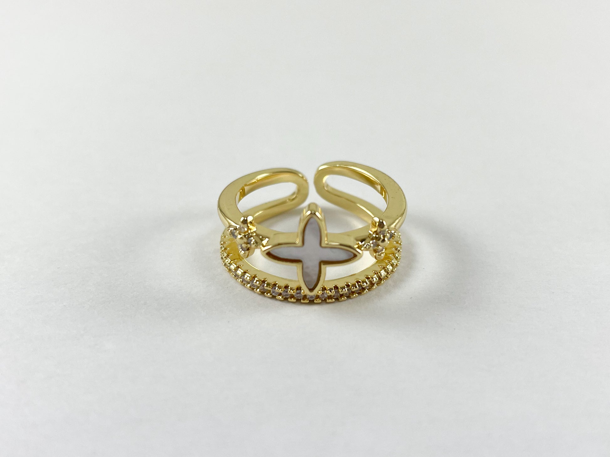 18K Gold and Platinum Plated Double Banded CZ Pave White Shell Clover Adjustable Ring 4pcs