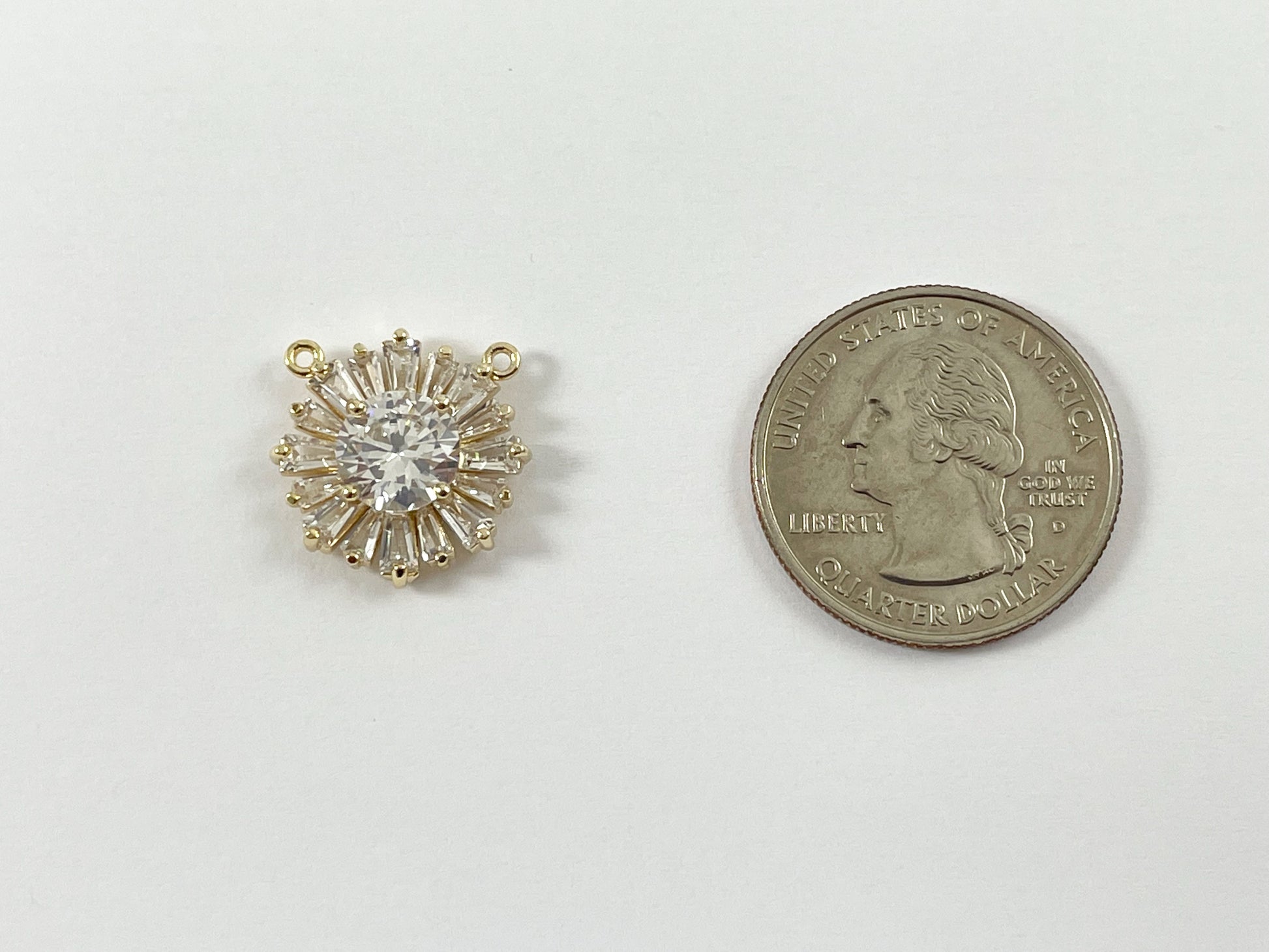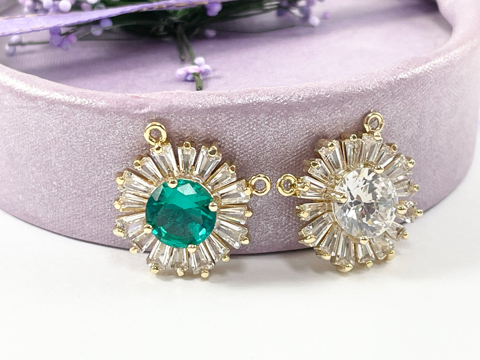 18K Gold Plated Brass Circle Baguette Cubic Zirconia Pave Rhinestone Clear Green Top Pendant Charm Over Brass 6pcs