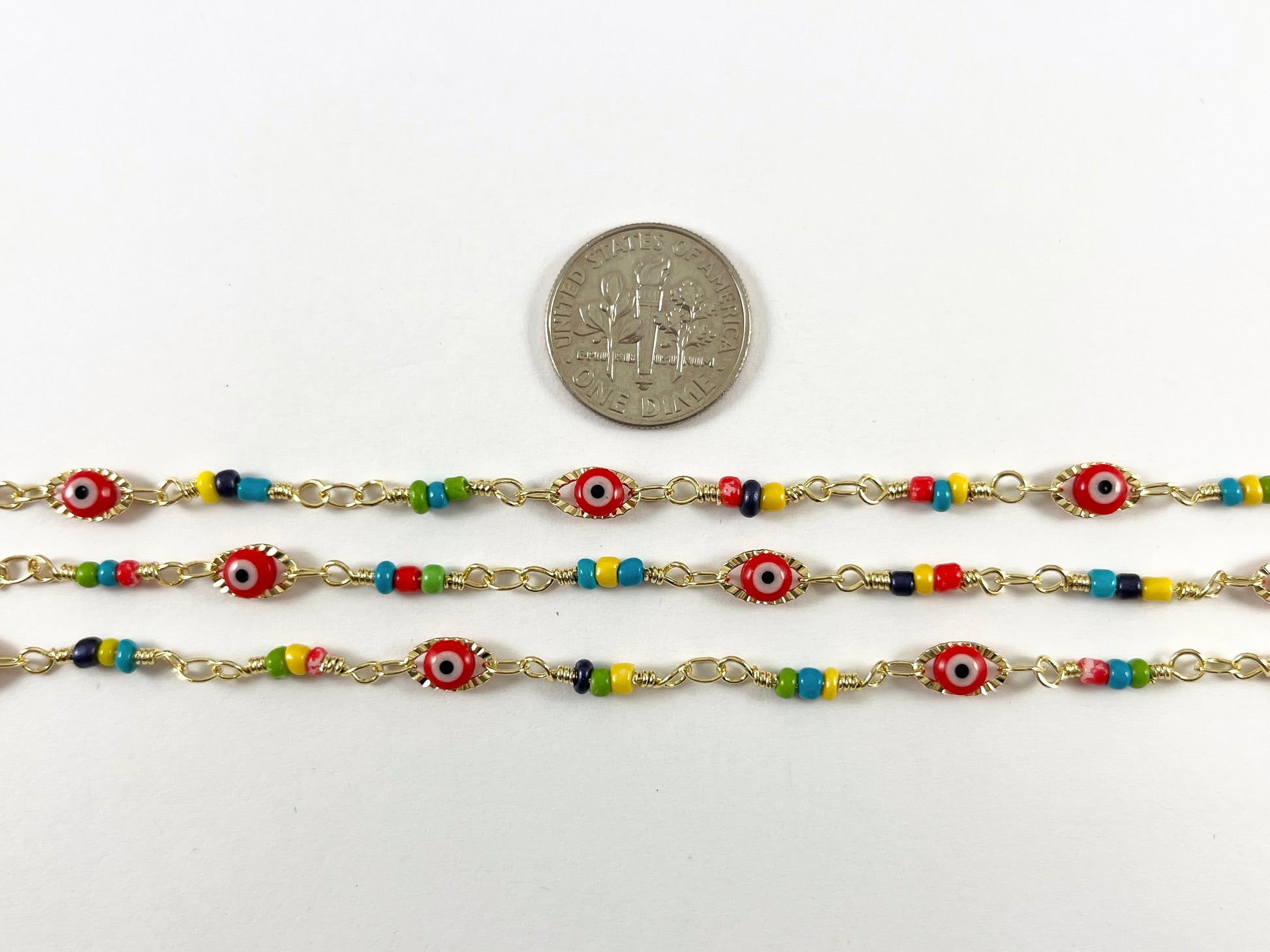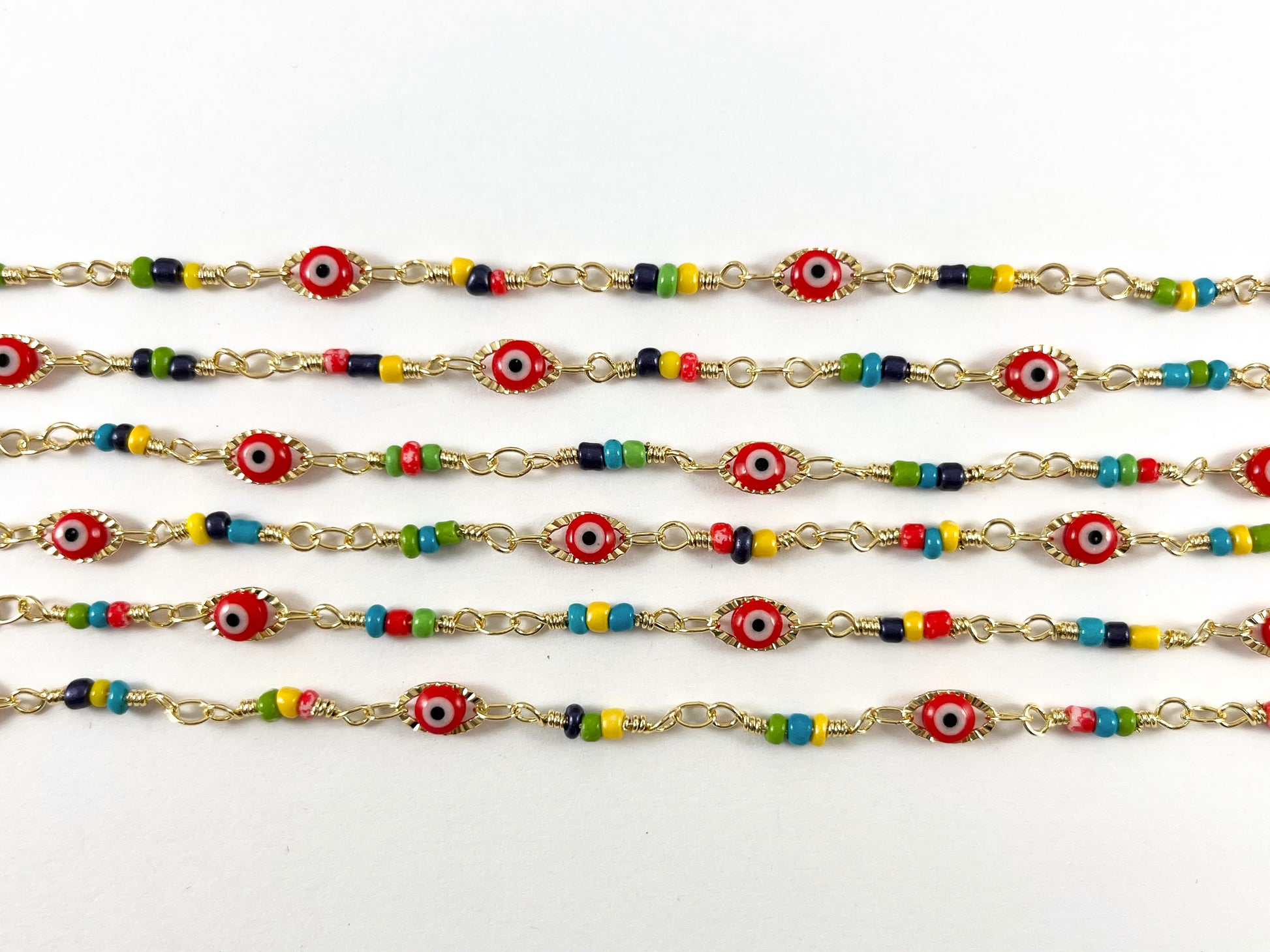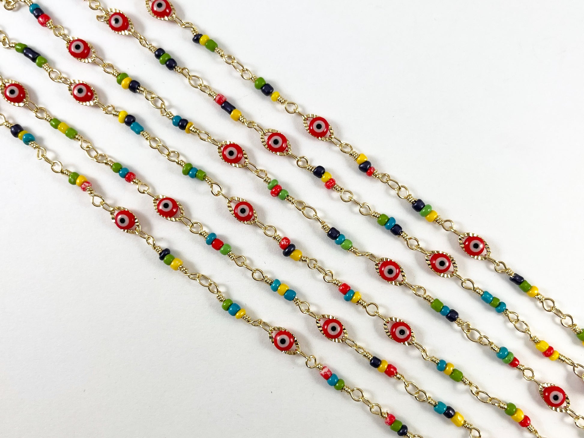 18K Gold Plated Copper Festival Multicolor Seed Bead with Red Evil Eye Chain By The Yard For Jewelry Making and Designs