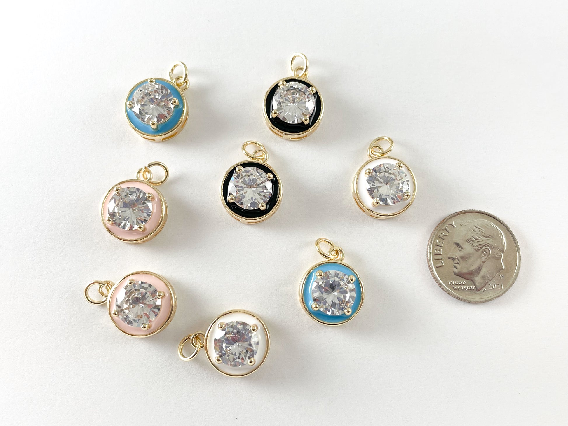 18K Gold Plated Enamel CZ Pave Coin Charms Over Copper 6pcs