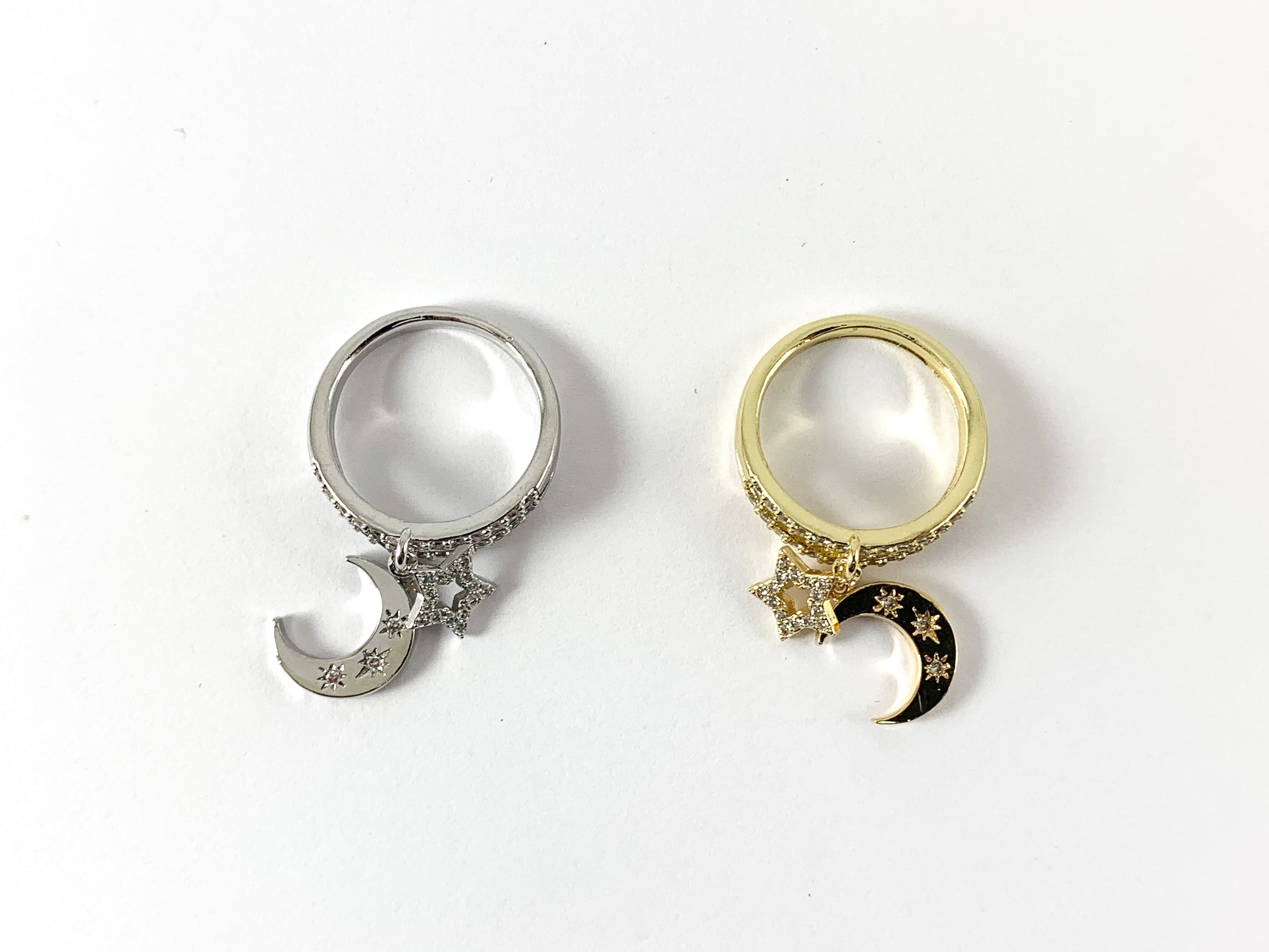 18K Real Gold/Platinum Plated CZ Pave Dangle Moon Star Charms Double Band Ring Size 6.5 4pcs