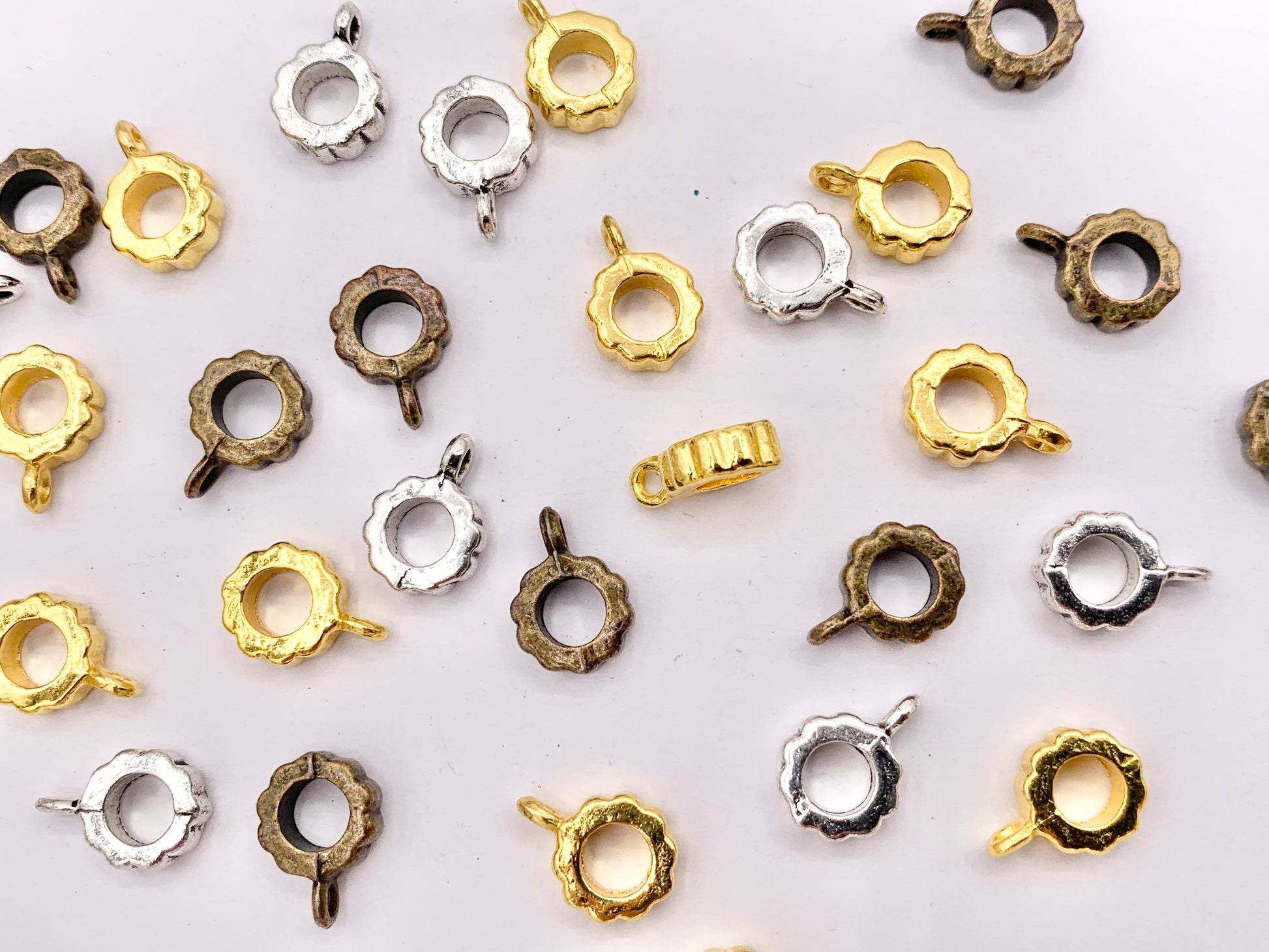 7.5mm Pewter Charm Holder Spacers Etched Spacers with Loop in Gold, Silver, Bronze 125g