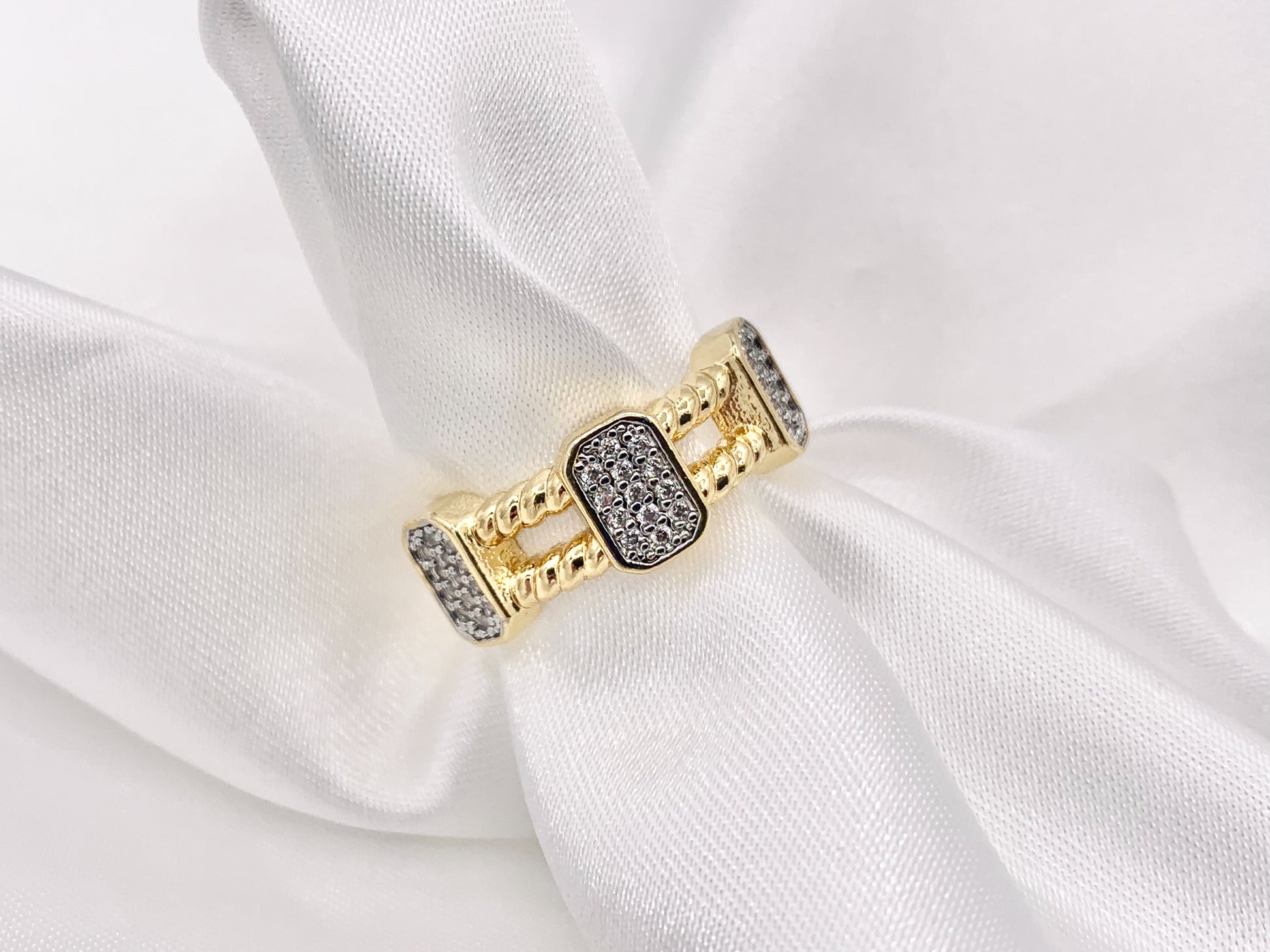 Beautiful 2 Tone Double Layers Band Rings with Silver CZ Pave Rectangles in 18K Gold and Silver Plated Copper 4 PCS