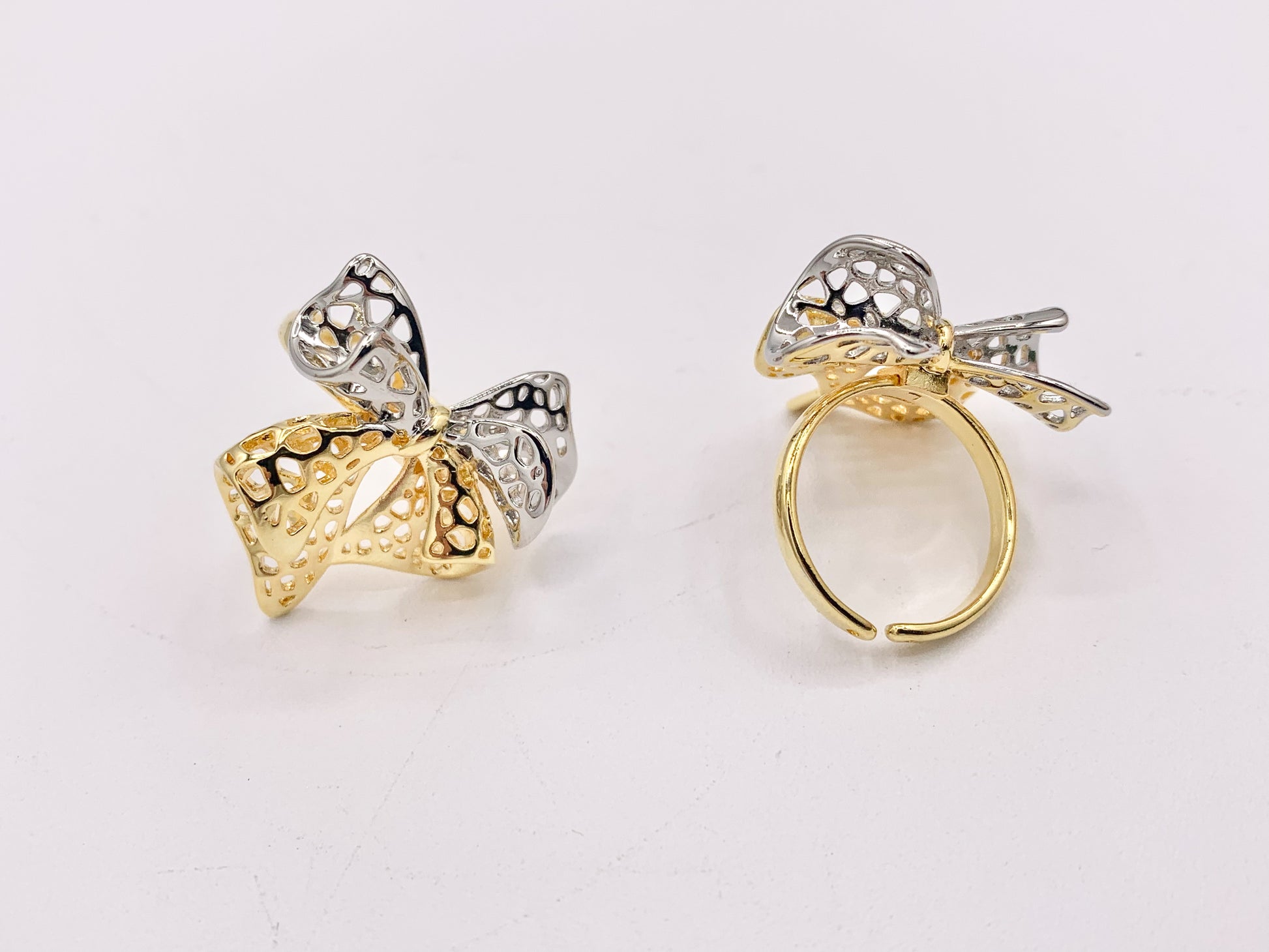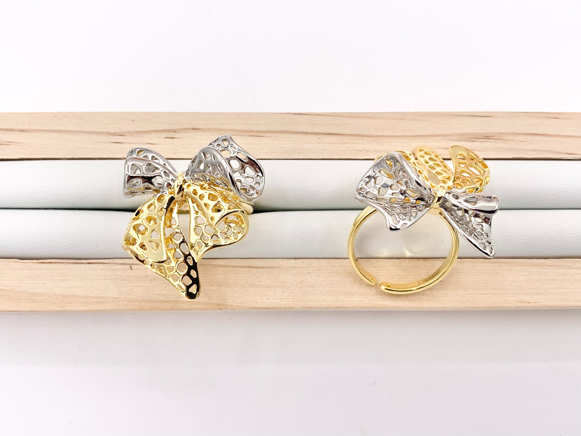 Beautiful 2 Tone Filigree Large 3D Bow Tie Adjustable Ring in Real Gold/Silver 18K Plated 4 PCS