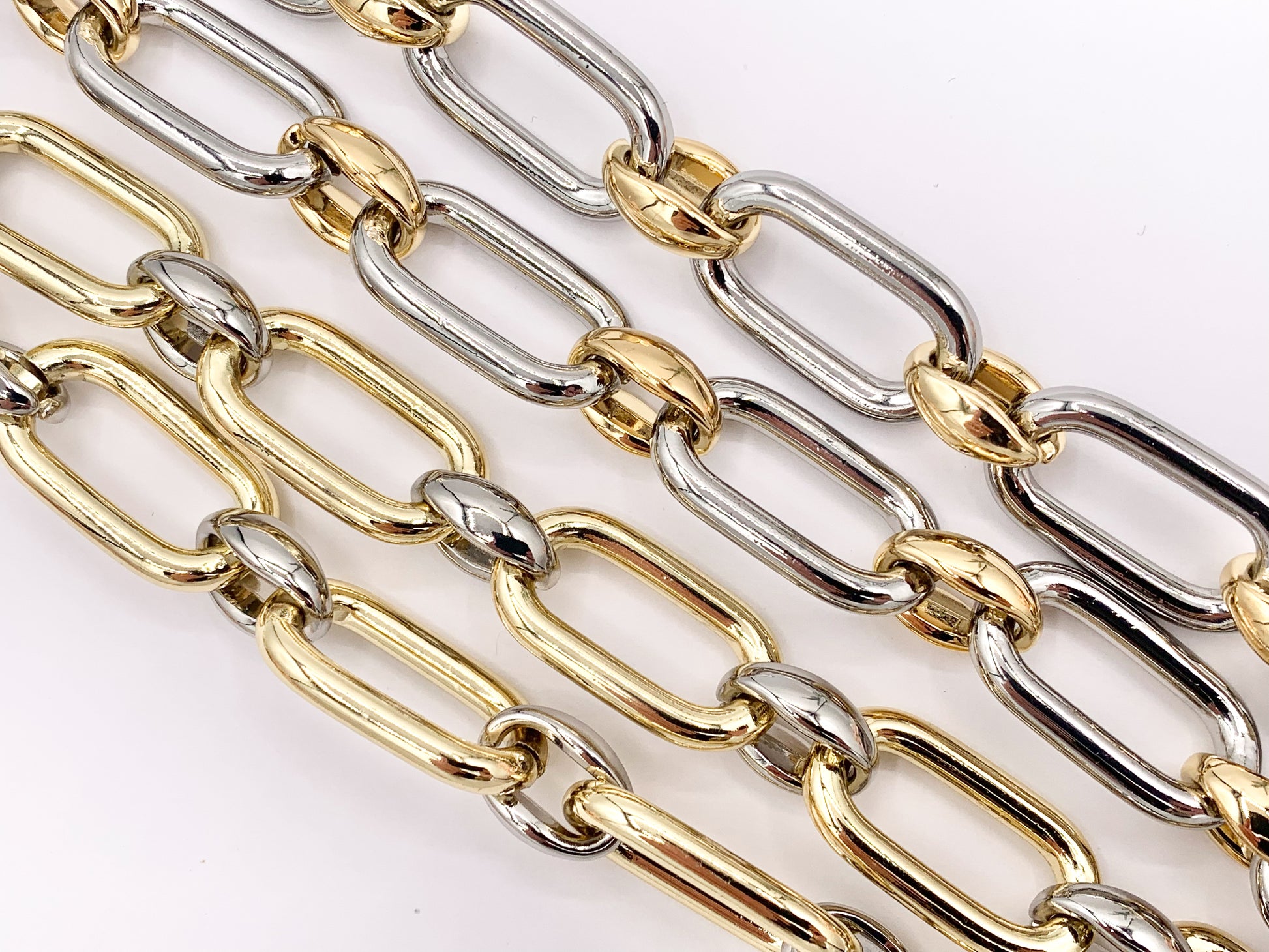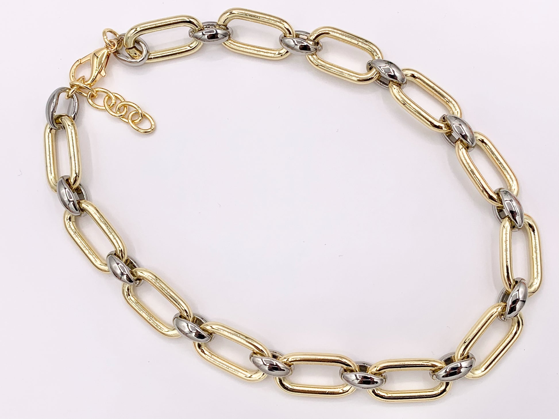 These chunky paperclip oval link chain necklaces are made with Gold/Silver 2 tone plated copper.