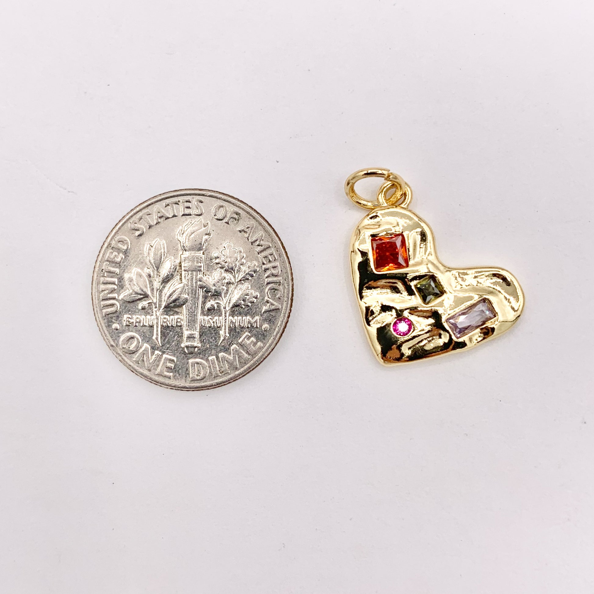 Colorful Rhinestone Heart Charm Hammered Pendants in CZ Pave 18K Gold Plated Copper 10 PCS