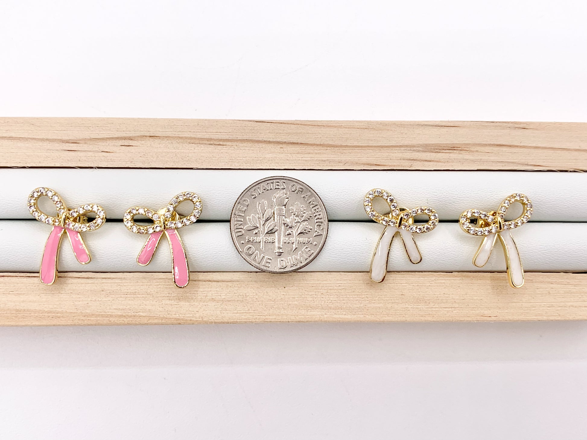 White and Pink Enamel Cute Bowtie Earring Studs in CZ Pave 18K Gold Plated Over Copper Earrings
