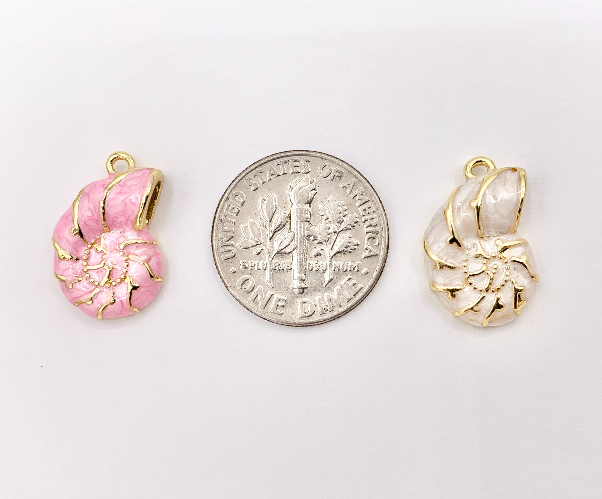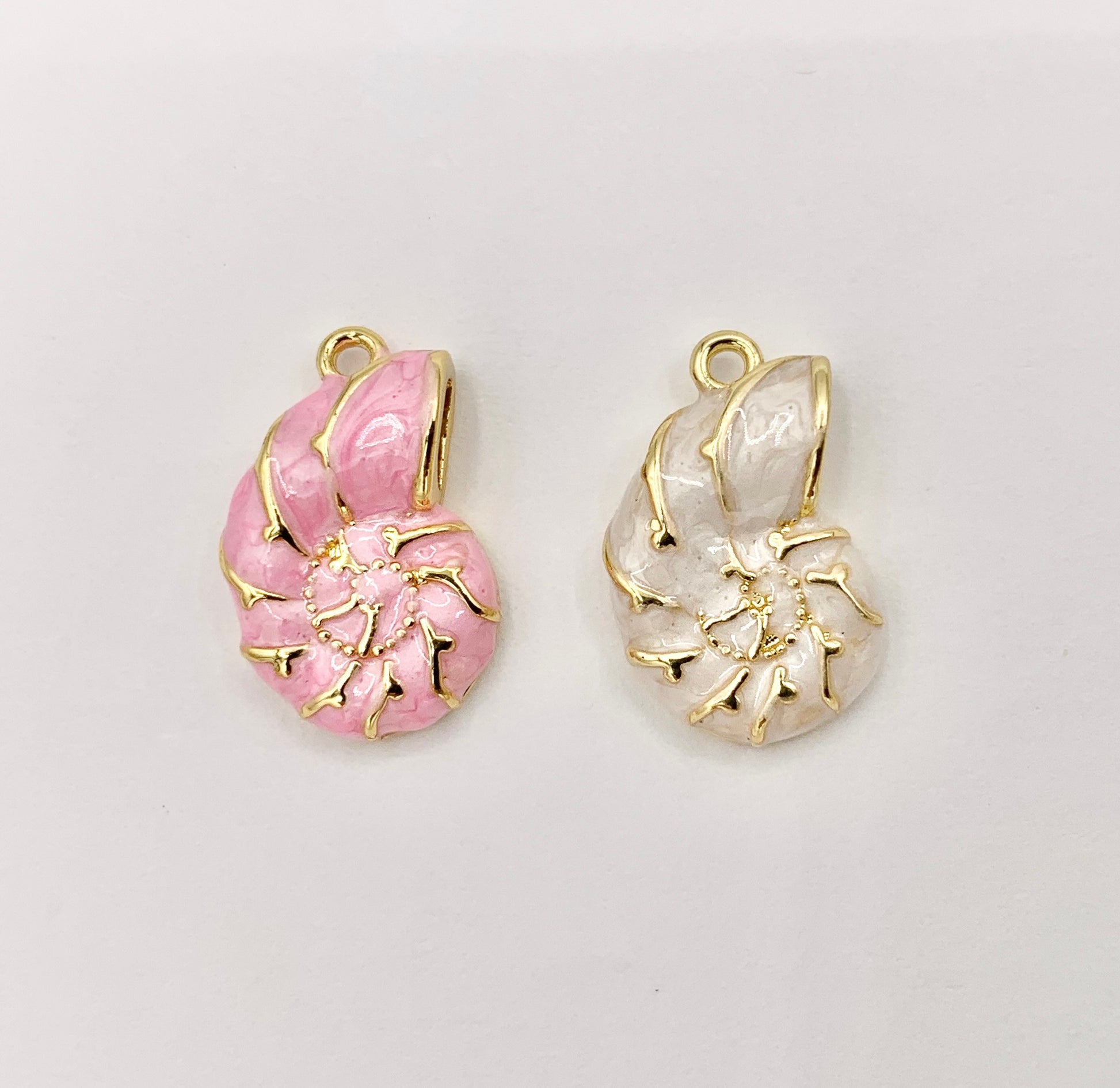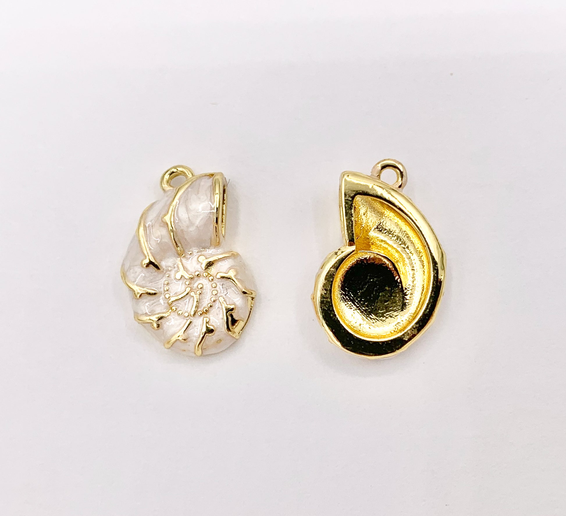 Cute Conch Shell Charms plated in 18K Gold Copper Base. These charms can be wonderful made into bracelets, dainty necklaces, earring drops and even used for crafts.