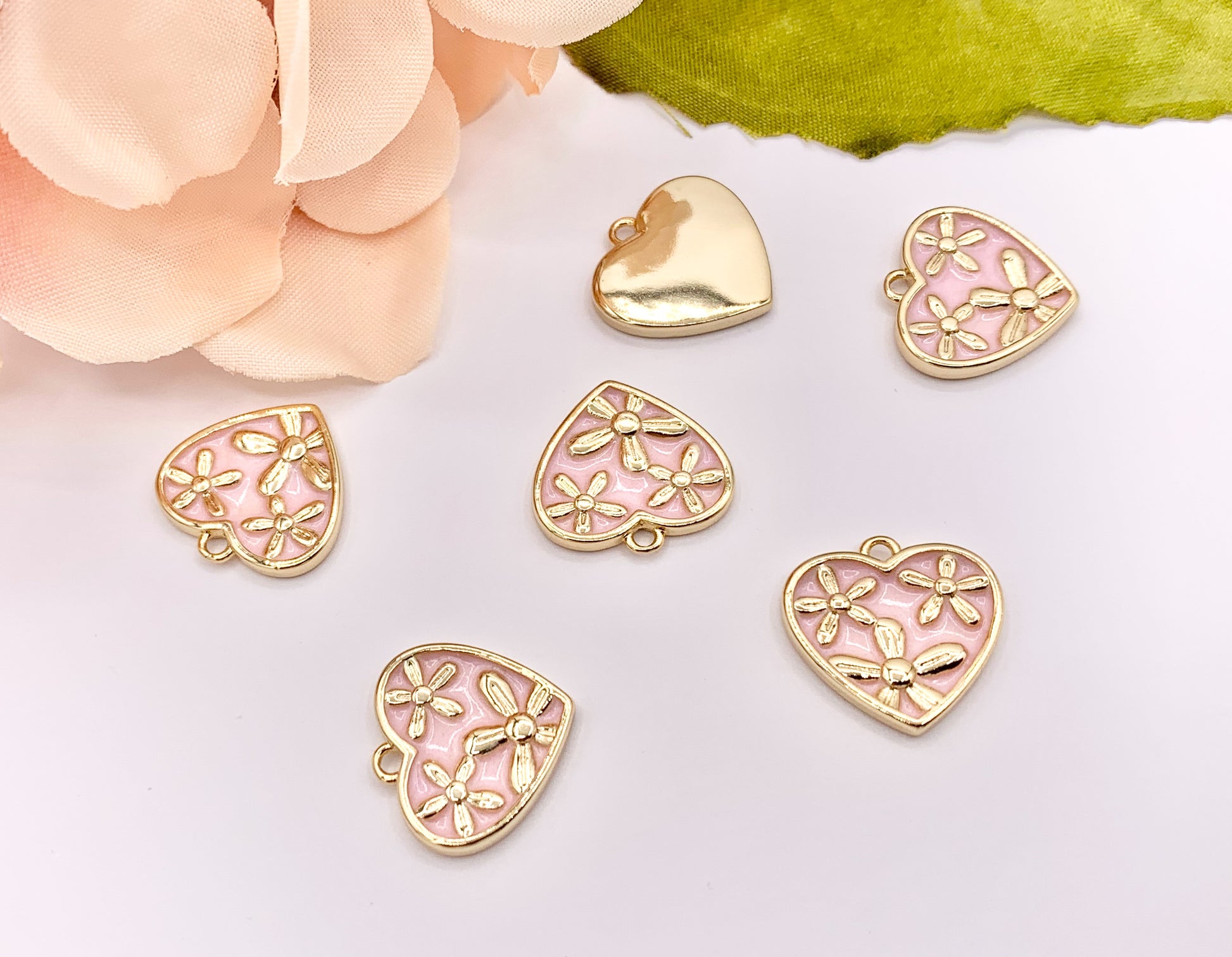 Cute Pink Enamel Floral Heart Charms in 18K Gold Plated Over Copper 8 PCS